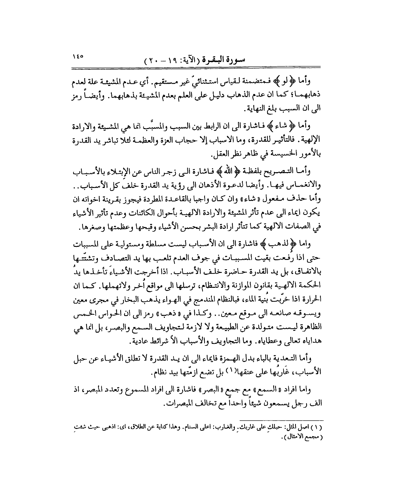 واما (لذهب) فاشارة الى ان الأسباب ليست مسلطة ومستولية على المسببات حتى اذا رُفعت بقيت المسببات في جوف العدم تلعب بها يد التصادف وتشتّتها بالاتفاق، بل يد القدرة حاضرة خلف الأسباب. اذا أخرجت الأشياءَ تأخذها يدُ الحكمة الالهية بقانون الموازنة والانتظام، ترسلها الى مواقع اُخر ولاتهملها. كما ان الحرارة اذا خرّبت بُنية الماء، فبالنظام المندمج في الهواء يذهب البخار في مجرى معين ويسوقه صانعه الى موقع معين.. وكذا في "ذهب" رمز الى ان الحواس الخمس الظاهرة ليست متولدة عن الطبيعة ولا لازمة لتجاويف السمع والبصر، بل انما هي هداياه تعالى وعطاياه. وما التجاويف والأسباب الاّ شرائط عادية.