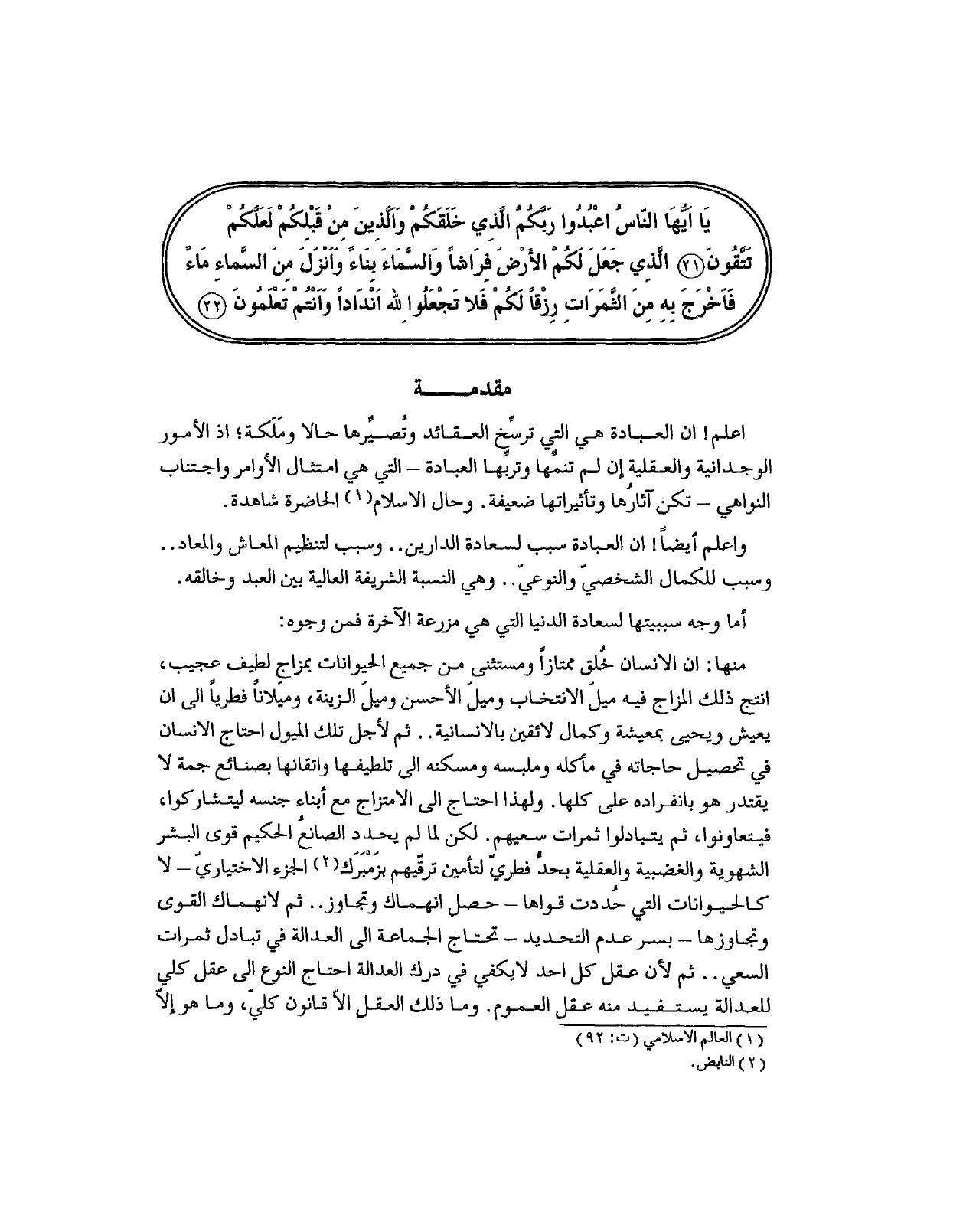 اعلم! ان العبادة هي التي ترسِّخ العقائد وتُصيِّرها حالا ومَلَكة؛ اذ الأمور الوجدانية والعقلية إن لم تنمِّها وتربِّها العبادة - التي هي امتثال الأوامر واجتناب النواهي - تكن آثارُها وتأثيراتها ضعيفة. وحال الاسلام 1 الحاضرة شاهدة.