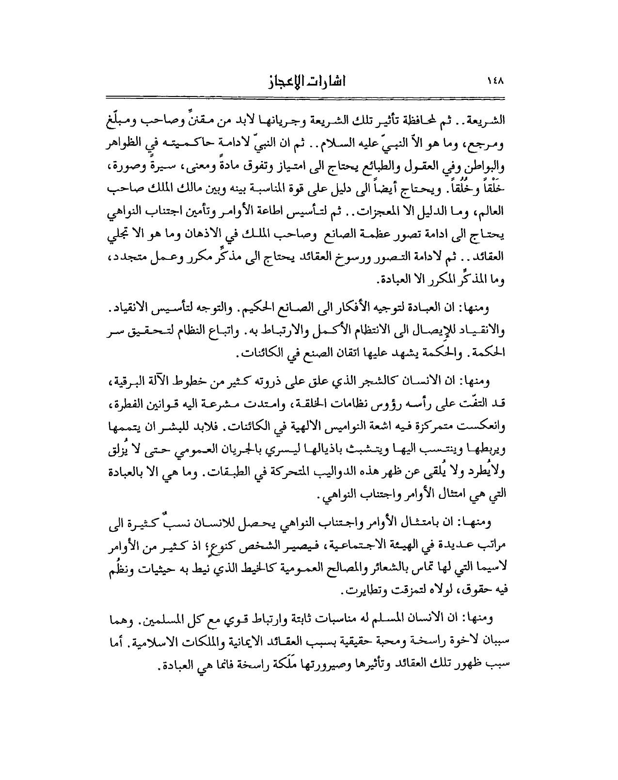 الشريعة.. ثم لمحافظة تأثير تلك الشريعة وجريانها لابد من مقننِّ وصاحب ومبلّغ ومرجع، وما هو الاّ النبيّ عليه السلام.. ثم ان النبيّ لادامة حاكميته في الظواهر والبواطن وفي العقول والطبائع يحتاج الى امتياز وتفوق مادةً ومعنى، سيرةً وصورة، خَلْقاً وخُلُقاً. ويحتاج أيضاً الى دليل على قوة المناسبة بينه وبين مالك الملك صاحب العالم، وما الدليل الا المعجزات.. ثم لتأسيس اطاعة الأوامر وتأمين اجتناب النواهي يحتاج الى ادامة تصور عظمة الصانع وصاحب الملك في الاذهان وما هو الا تجلي العقائد.. ثم لادامة التصور ورسوخ العقائد يحتاج الى مذكِّر مكرر وعمل متجدد، وما المذكِّر المكرر الا العبادة.