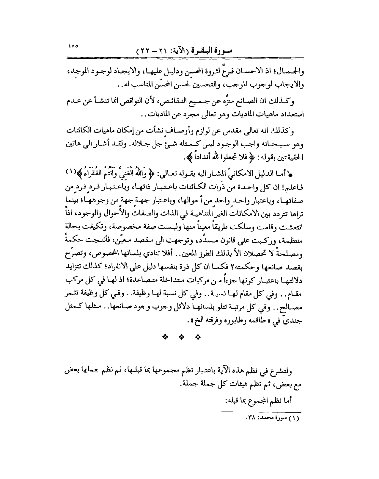 وكذلك انه تعالى مقدس عن لوازم وأوصافٍ نشأت من إمكان ماهيات الكائنات وهو سبحانه واجب الوجود ليس كمثله شئ جل جلاله. ولقد أشار الى هاتين الحقيقتين بقوله: (فلا تجعلوا لله أنداداً) .