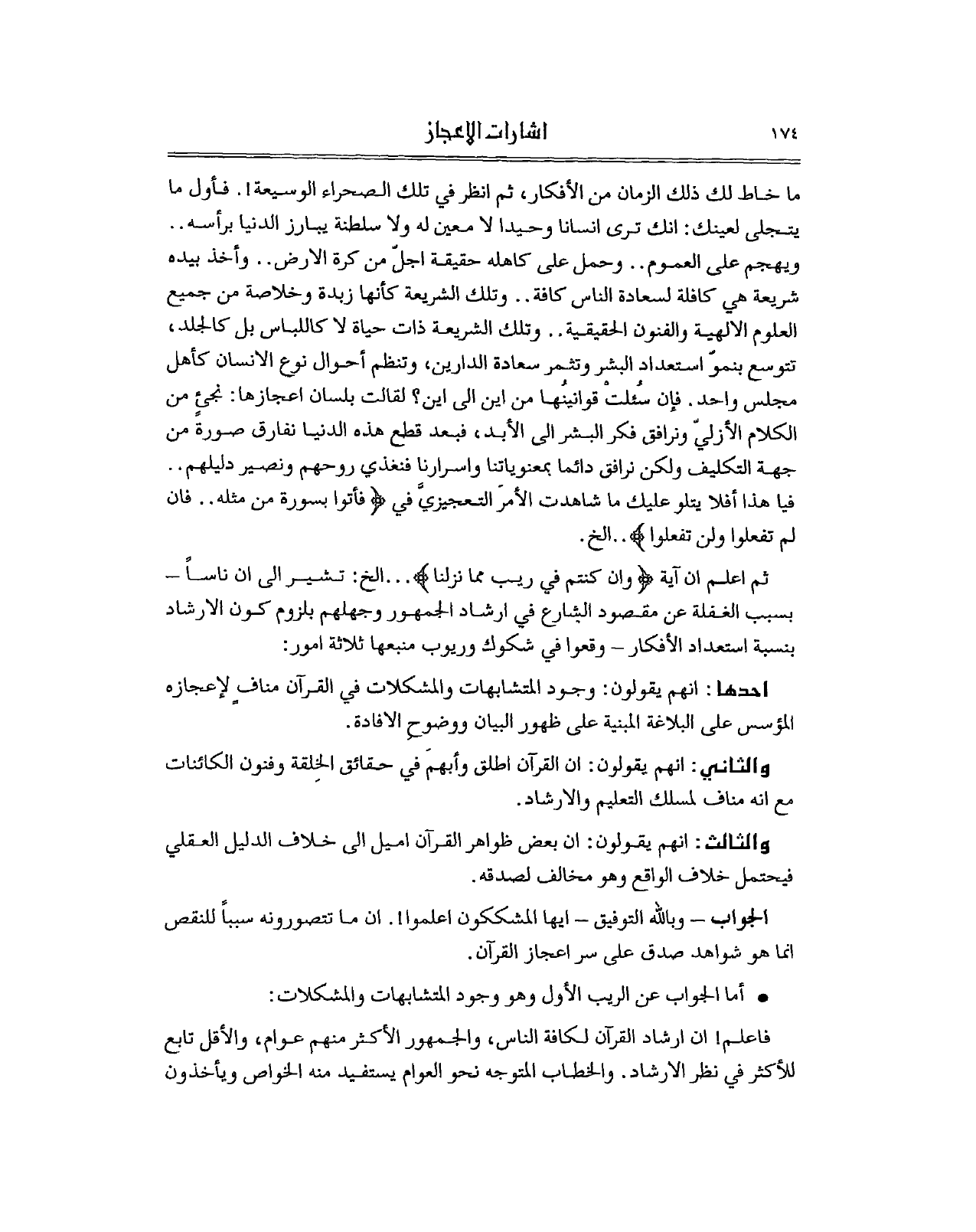 والثاني: انهم يقولون: ان القرآن الكريم اطلق وأبهمَ في حقائق الخِلقة وفنون الكائنات مع انه مناف لمسلك التعليم والارشاد.
