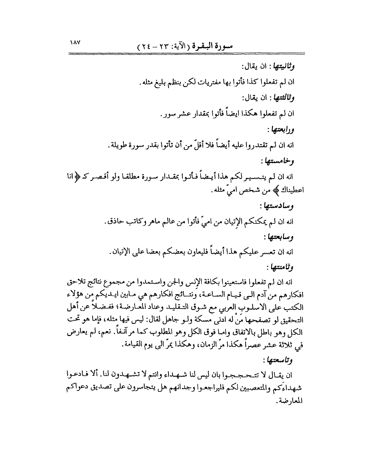 انه ان لم تفعلوا فاستعينوا بكافة الإِنس والجن واستمدوا من مجموع نتائج تلاحق افكارهم من آدم الى قيام الساعة، ونتائج افكارهم هي مابين ايديكم من هؤلاء الكتب على الاسلوب العربي مع شوق التقليد وعناد المعارضة؛ ففضلاً عن أهل التحقيق لو تصفحها مَنْ له ادنى مسكة ولو جاهل لقال: ليس فيها مثله، فإما هو تحت الكل وهو باطل بالاتفاق واما فوق الكل وهو المطلوب كما مر آنفاً. نعم، لم يعارض في ثلاثة عشر عصراً هكذا مرّ الزمان، وهكذا يمرّ الى يوم القيامة.