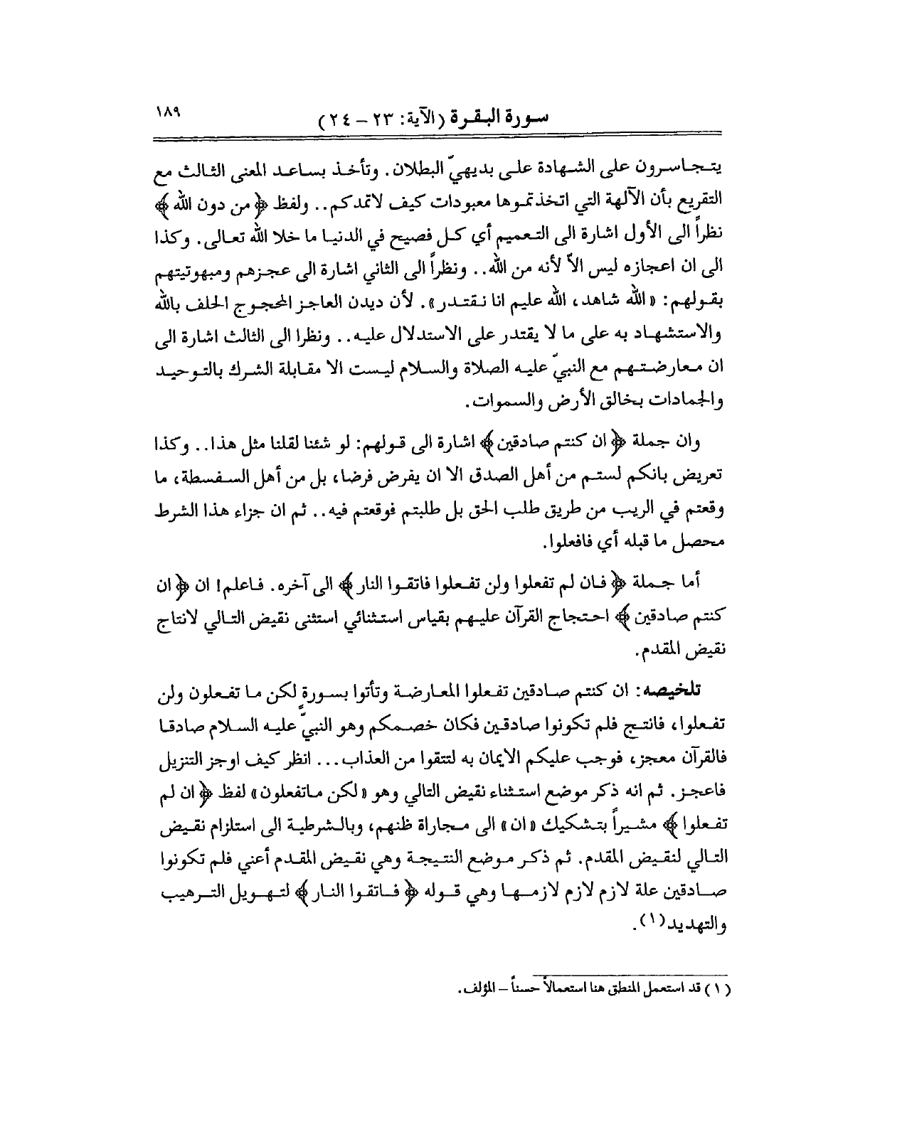 أما جملة (فان لم تفعلوا ولن تفعلوا فاتقوا النار) الى آخره. فاعلم! ان (ان كنتم صادقين) احتجاج القرآن عليهم بقياس استثنائي استثنى نقيض التالي لانتاج نقيض المقدم.