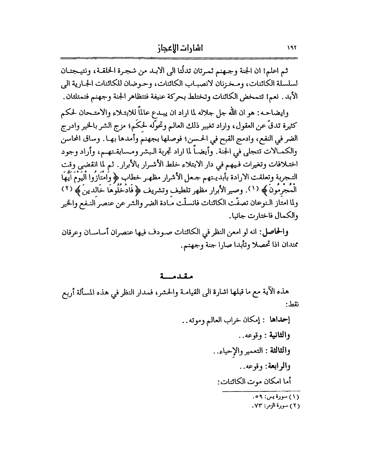 ثم اعلم! ان الجنة وجهنم ثمرتان تدلّتا الى الابد من شجرة الخلقة، ونتيجتان لسلسلة الكائنات، ومخزنان لانصباب الكائنات، وحوضان للكائنات الجارية الى الأبد. نعم! تتمخض الكائنات وتختلط بحركة عنيفة فتتظاهر الجنة وجهنم فتمتلئان.