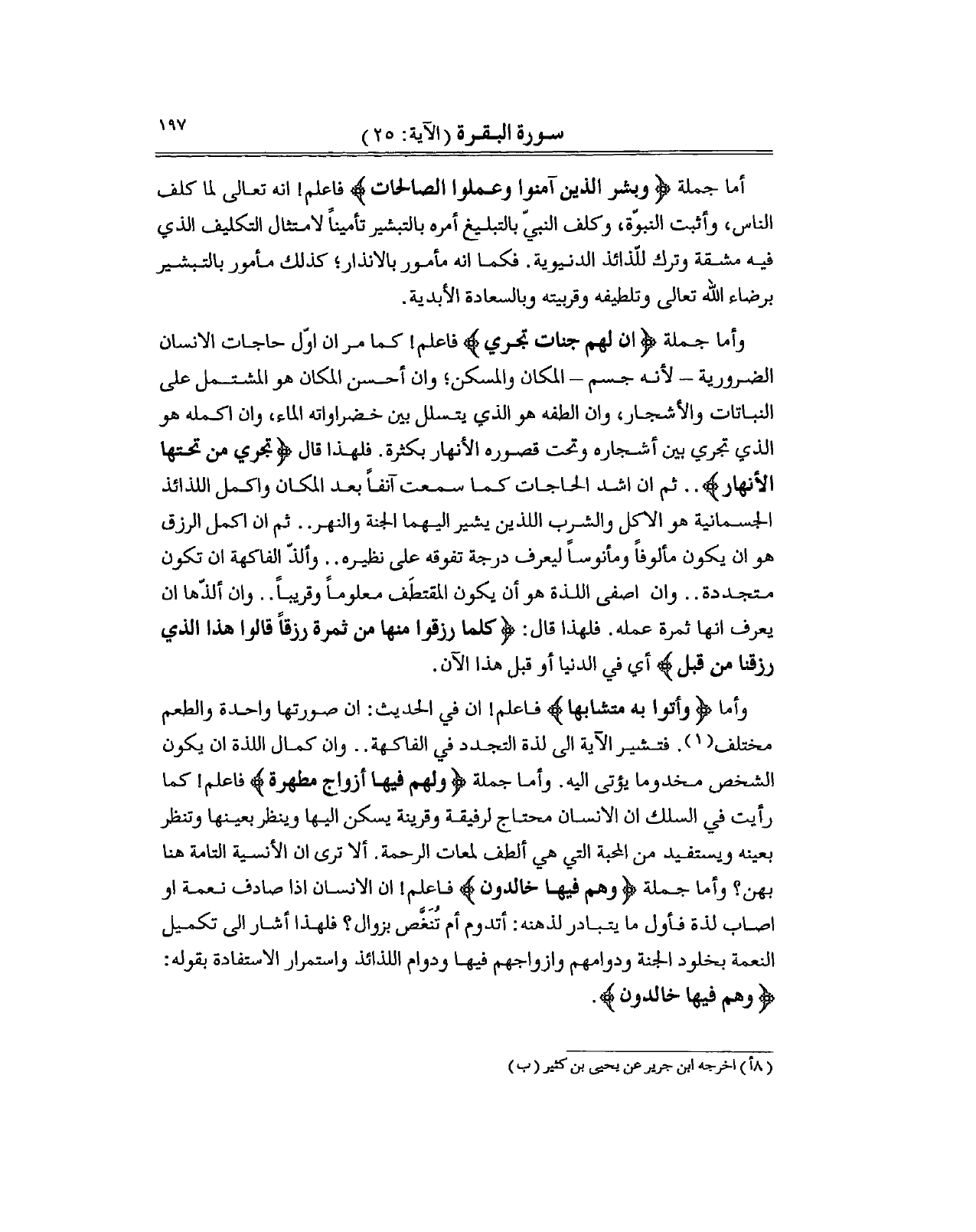 وأما جملة (ان لهم جنات تجري) فاعلم! كما مر ان اوّل حاجات الانسان الضرورية - لأنه جسم - المكان والمسكن؛ وان أحسن المكان هو المشتمل على النباتات والأشجار، وان الطفه هو الذي يتسلل بين خضراواته الماء، وان اكمله هو الذي تجري بين أشجاره وتحت قصوره الأنهار بكثرة. فلهذا قال (تجري من تحتها الأنهار) .. ثم ان اشد الحاجات كما سمعت آنفاً بعد المكان واكمل اللذائذ الجسمانية هو الاكل والشرب اللذين يشير اليهما الجنة والنهر.. ثم ان اكمل الرزق هو ان يكون مألوفاً ومأنوساً ليعرف درجة تفوقه على نظيره.. وألذّ الفاكهة ان تكون متجددة.. وان اصفى اللذة هو أن يكون المقتطَف معلوماً وقريباً.. وان ألذّها ان يعرف انها ثمرة عمله. فلهذا قال: (كلما رزقوا منها من ثمرة رزقاً قالوا هذا الذي رزقنا من قبل) أي في الدنيا أو قبل هذا الآن.