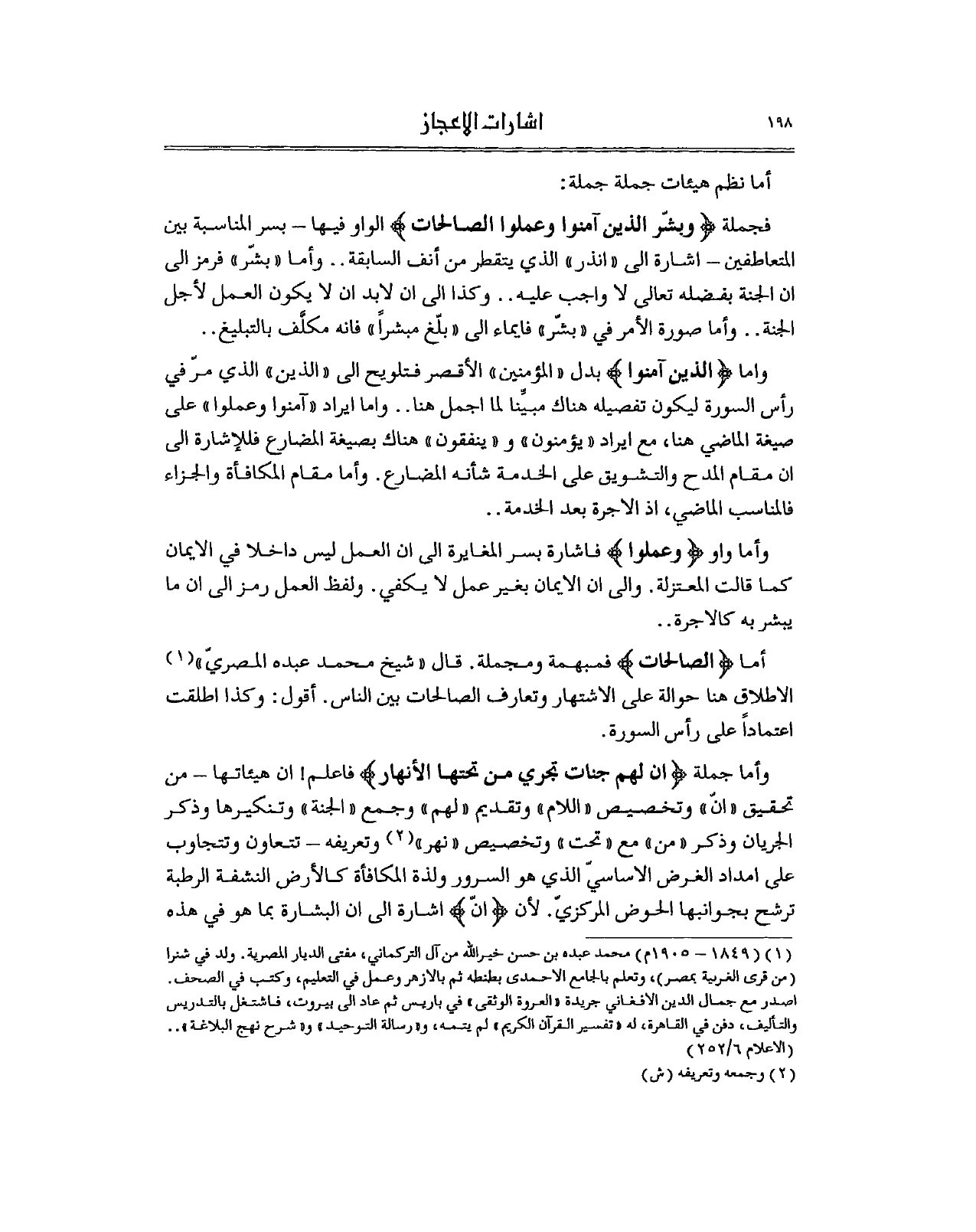 أما (الصالحات) فمبهمة ومجملة. قال "شيخ محمد عبده المصريّ" 1 الاطلاق هنا حوالة على الاشتهار وتعارف الصالحات بين الناس. أقول: وكذا اطلقت اعتماداً على رأس السورة.