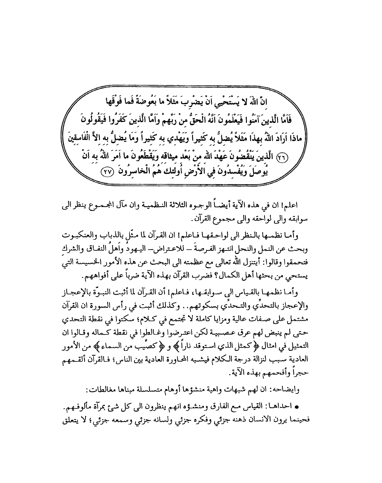 وأما نظمها بالقياس الى سوابقها، فاعلم! أن القرآن لما أثبت النبوّة بالإعجاز والإعجاز بالتحدِّي والتحدِّي بسكوتهم.. وكذلك أثبت في رأس السورة ان القرآن مشتمل على صفات عالية ومزايا كاملة لا تجتمع في كلام؛ سكتوا في نقطة التحدي حتى لم ينبض لهم عرق عصبية لكن اعترضوا وغالطوا في نقطة كماله وقالوا ان التمثيل في امثال (كمثل الذي استوقد ناراً) و (كصِّيب من السماء) من الأمور العادية سبب لنزالة درجة الكلام فيشبه المحاورة العادية بين الناس؛ فالقرآن ألقمهم حجراً وأفحمهم بهذه الآية.