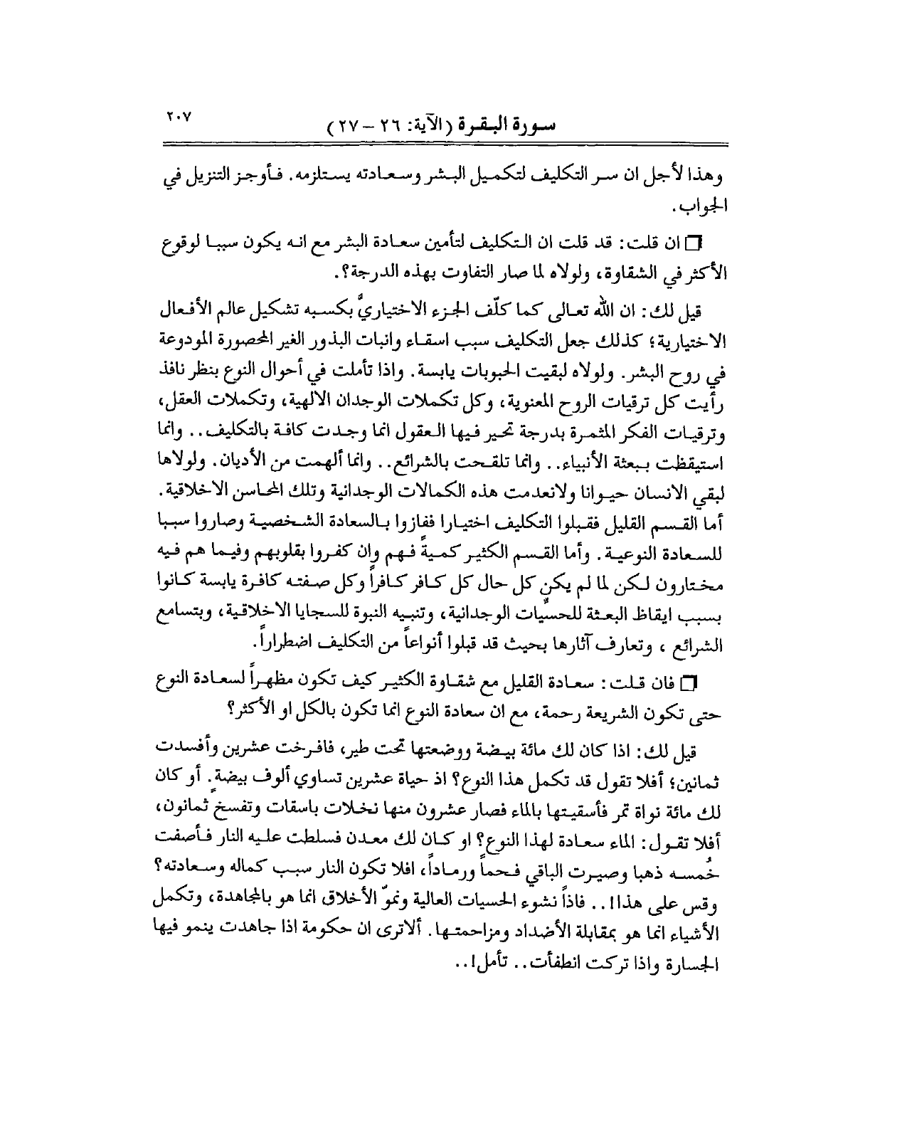 قيل لك: ان الله تعالى كما كلّف الجزء الاختياريَّ بكسبه تشكيل عالم الأفعال الاختيارية؛ كذلك جعل التكليف سبب اسقاء وانبات البذور الغير المحصورة المودوعة في روح البشر. ولولاه لبقيت الحبوبات يابسة. واذا تأملت في أحوال النوع بنظر نافذ رأيت كل ترقيات الروح المعنوية، وكل تكملات الوجدان الالهية، وتكملات العقل، وترقيات الفكر المثمرة بدرجة تحير فيها العقول انما وجدت كافة بالتكليف.. وانما استيقظت ببعثة الأنبياء.. وانما تلقحت بالشرائع.. وانما ألهمت من الأديان. ولولاها لبقي الانسان حيوانا ولانعدمت هذه الكمالات الوجدانية وتلك المحاسن الاخلاقية. أما القسم القليل فقبلوا التكليف اختيارا ففازوا بالسعادة الشخصية وصاروا سببا للسعادة النوعية. وأما القسم الكثير كميةً فهم وان كفروا بقلوبهم وفيما هم فيه مختارون لكن لما لم يكن كل حال كل كافر كافراً وكل صفته كافرة يابسة كانوا بسبب ايقاظ البعثة للحسِّيات الوجدانية، وتنبيه النبوة للسجايا الاخلاقية، وبتسامع الشرائع، وتعارف آثارها بحيث قد قبلوا أنواعاً من التكليف اضطراراً.