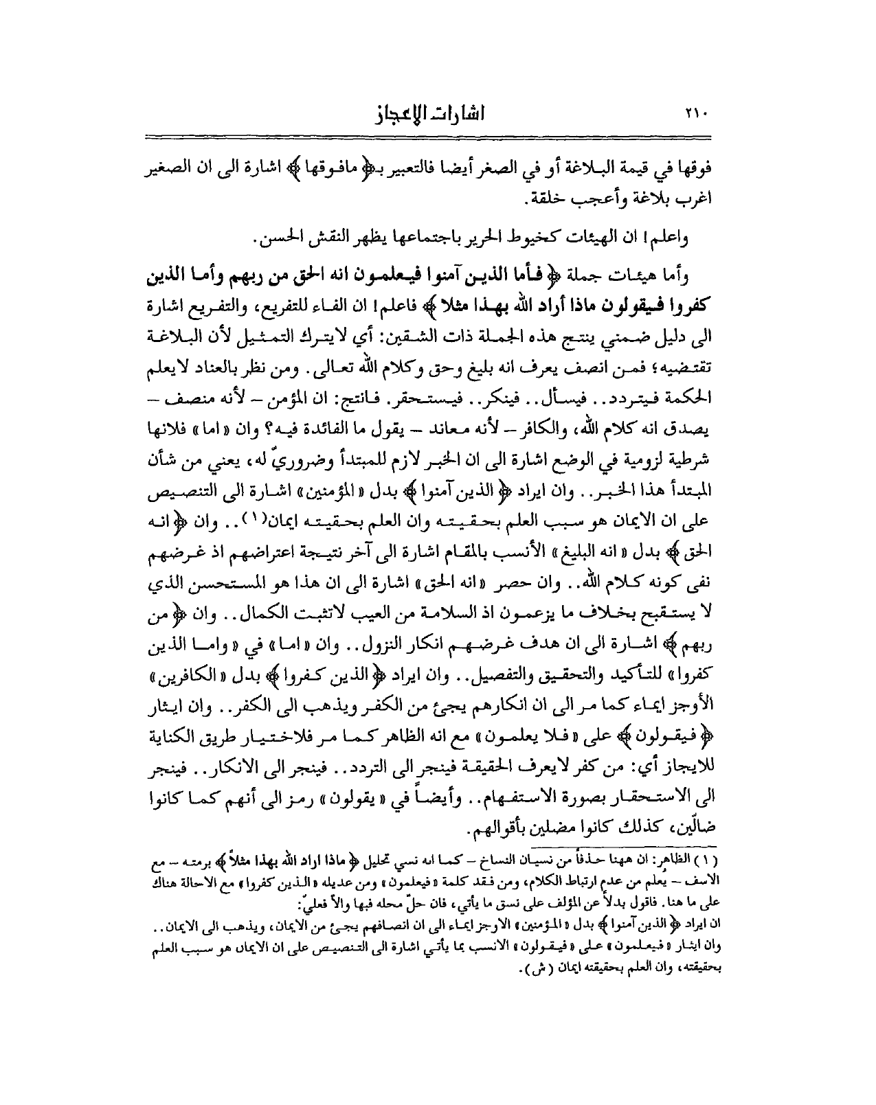 وأما هيئات جملة (فأما الذين آمنوا فيعلمون انه الحق من ربهم وأما الذين كفروا فيقولون ماذا أراد الله بهذا مثلا) فاعلم! ان الفاء للتفريع، والتفريع اشارة الى دليل ضمني ينتج هذه الجملة ذات الشقين: أي لايترك التمثيل لأن البلاغة تقتضيه؛ فمن انصف يعرف انه بليغ وحق وكلام الله تعالى. ومن نظر بالعناد لايعلم الحكمة فيتردد.. فيسأل.. فينكر.. فيستحقر. فانتج: ان المؤمن - لأنه منصف - يصدق انه كلام الله، والكافر - لأنه معاند - يقول ما الفائدة فيه؟ وان "اما" فلانها شرطية لزومية في الوضع اشارة الى ان الخبر لازم للمبتدأ وضروريّ له، يعني من شأن المبتدأ هذا الخبر.. وان ايراد (الذين آمنوا) بدل "المؤمنين" اشارة الى التنصيص على ان الايمان هو سبب العلم بحقيته وان العلم بحقيته ايمان 1.. وان (انه الحق) بدل "انه البليغ" الأنسب بالمقام اشارة الى آخر نتيجة اعتراضهم اذ غرضهم نفى كونه كلام الله.. وان حصر "انه الحق" اشارة الى ان هذا هو المستحسن الذي لا يستقبح بخلاف ما يزعمون اذ السلامة من العيب لاتثبت الكمال.. وان (من ربهم) اشارة الى ان هدف غرضهم انكار النزول.. وان "اما" في "واما الذين كفروا" للتأكيد والتحقيق والتفصيل.. وان ايراد (الذين كفروا) بدل "الكافرين" الأوجز ايماء كما مر الى ان انكارهم يجئ من الكفر ويذهب الى الكفر.. وان ايثار (فيقولون) على "فلا يعلمون" مع انه الظاهر كما مر فلاختيار طريق الكناية للايجاز أي: من كفر لايعرف الحقيقة فينجر الى التردد.. فينجر الى الانكار.. فينجر الى الاستحقار بصورة الاستفهام.. وأيضاً في "يقولون" رمز الى أنهم كما كانوا ضالّين، كذلك كانوا مضلين بأقوالهم.