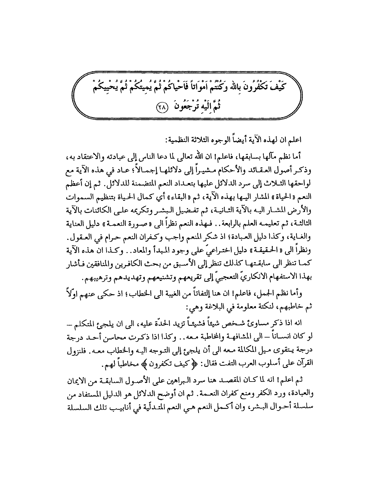 انه اذا ذكر مساوئ شخص شيئاً فشيئاً تزيد الحدّة عليه، الى ان يلجئ المتكلم - لو كان انساناً - الى المشافهة والمخاطبة معه.. وكذا اذا ذكرت محاسن أحد درجة درجة يتقوى ميل المكالمة معه الى أن يلجئ إلى التوجه اليه والخطاب معه. فلنزول القرآن على أسلوب العرب التفت فقال: (كيف تكفرون) مخاطباً لهم.