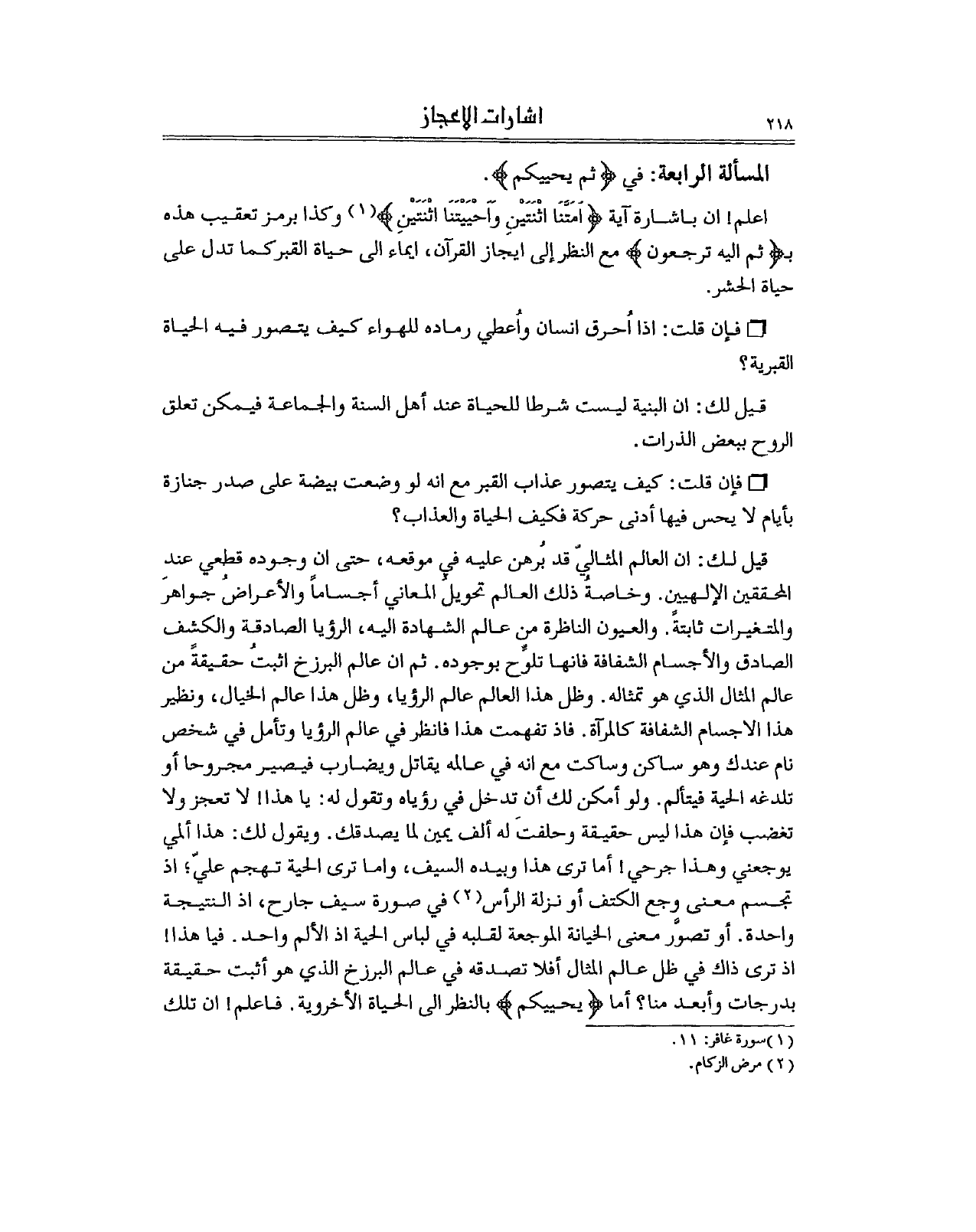 قيل لك: ان العالم المثاليّ قد بُرهن عليه في موقعه، حتى ان وجوده قطعي عند المحققين الإلهيين. وخاصةُ ذلك العالم تحويلُ المعاني أجساماً والأعراضُ جواهرَ والمتغيرات ثابتةً. والعيون الناظرة من عالم الشهادة اليه، الرؤيا الصادقة والكشف الصادق والأجسام الشفافة فانها تلوِّح بوجوده. ثم ان عالم البرزخ اثبتُ حقيقةً من عالم المثال الذي هو تمثاله. وظل هذا العالم عالم الرؤيا، وظل هذا عالم الخيال، ونظير هذا الاجسام الشفافة كالمرآة. فاذ تفهمت هذا فانظر في عالم الرؤيا وتأمل في شخص نام عندك وهو ساكن وساكت مع انه في عالمه يقاتل ويضارب فيصير مجروحا أو تلدغه الحية فيتألم. ولو أمكن لك أن تدخل في رؤياه وتقول له: يا هذا! لا تعجز ولا تغضب فإن هذا ليس حقيقة وحلفتَ له ألف يمين لما يصدقك. ويقول لك: هذا ألمي يوجعني وهذا جرحي! أما ترى هذا وبيده السيف، واما ترى الحية تهجم عليّ؛ اذ تجسم معنى وجع الكتف أو نزلة الرأس 2 في صورة سيف جارح، اذ النتيجة واحدة. أو تصوَّر معنى الخيانة الموجعة لقلبه في لباس الحية اذ الألم واحد. فيا هذا! اذ ترى ذاك في ظل عالم المثال أفلا تصدقه في عالم البرزخ الذي هو أثبت حقيقة بدرجات وأبعد منا؟ أما (يحييكم) بالنظر الى الحياة الأخروية. فاعلم! ان تلك