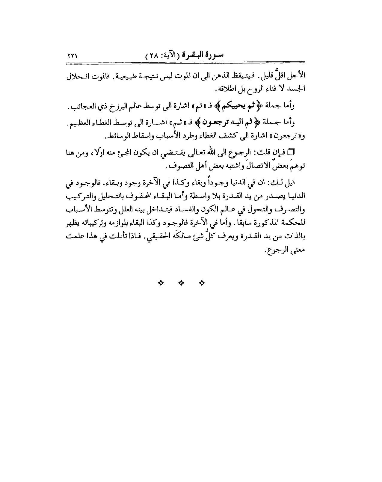 وأما جملة (ثم اليه ترجعون) فـ "ثم" اشارة الى توسط الغطاء العظيم. و"ترجعون" اشارة الى كشف الغطاء وطرد الأسباب واسقاط الوسائط.