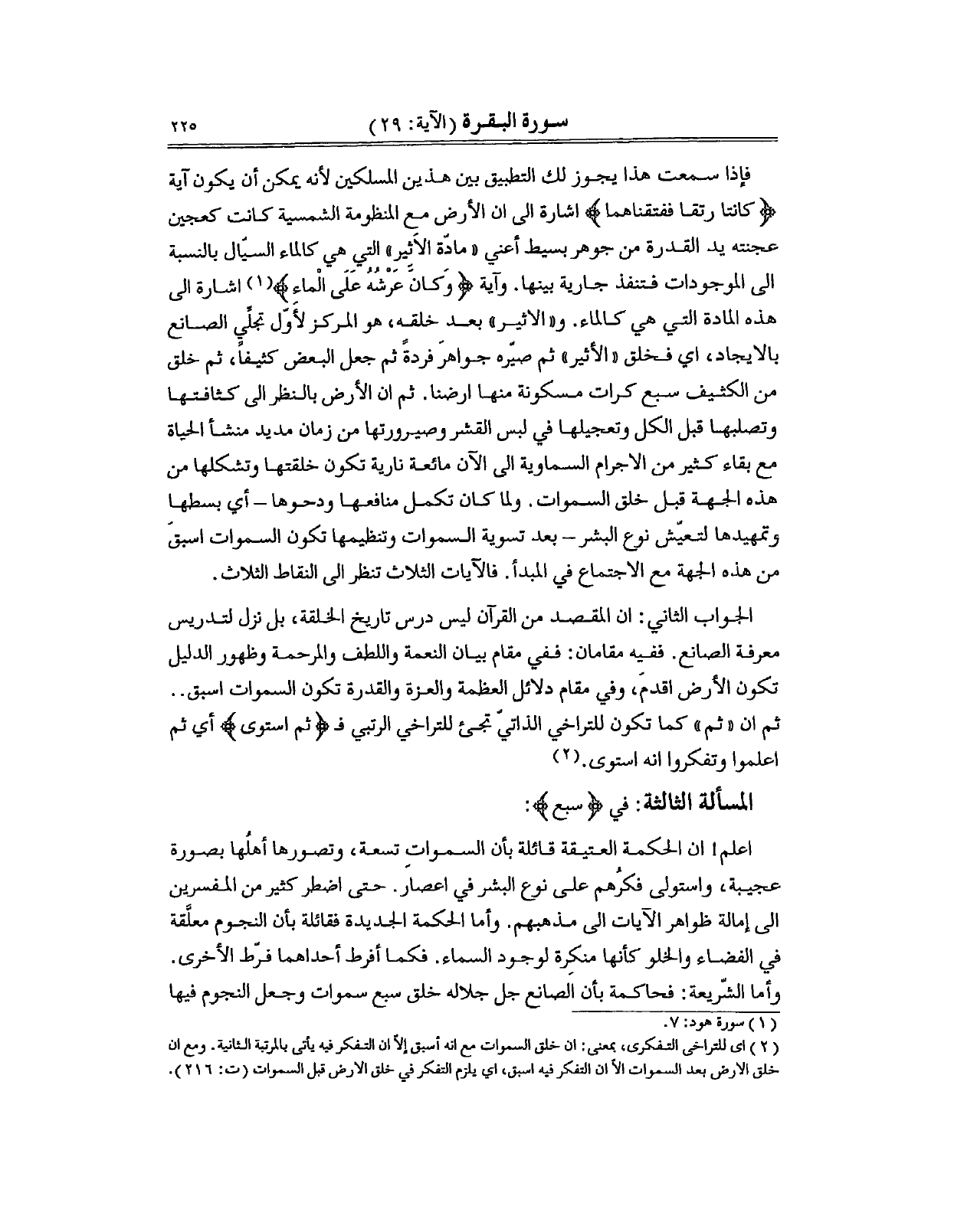الجواب الثاني: ان المقصد من القرآن الكريم ليس درس تاريخ الخلقة، بل نزل لتدريس معرفة الصانع. ففيه مقامان: ففي مقام بيان النعمة واللطف والمرحمة وظهور الدليل تكون الأرض اقدمَ، وفي مقام دلائل العظمة والعزة والقدرة تكون السموات اسبق.. ثم ان "ثم" كما تكون للتراخي الذاتيّ تجئ للتراخي الرتبي فـ (ثم استوى) أي ثم اعلموا وتفكروا انه استوى. 2