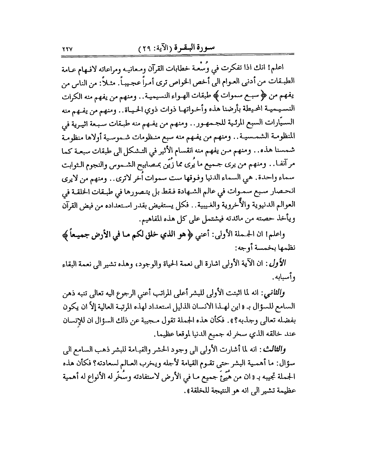 اعلم! انك اذا تفكرت في وُسْعة خطابات القرآن الكريم ومعانيه ومراعاته لافهام عامة الطبقات من أدنى العوام الى أخص الخواص ترى أمراً عجيباً. مثلاً: من الناس من يفهم من (سبع سموات) طبقات الهواء النسيمية.. ومنهم من يفهم منه الكرات النسيمية المحيطة بأرضنا هذه وأخواتها ذوات ذوي الحياة.. ومنهم من يفهم منه السيّارات السبع المرئية للجمهور.. ومنهم من يفهم منه طبقات سبعة اثيرية في المنظومة الشمسية.. ومنهم من يفهم منه سبع منظومات شموسية أولاها منظومة شمسنا هذه.. ومنهم من يفهم منه انقسام الأثير في التشكل الى طبقات سبعة كما مر آنفا.. ومنهم من يرى جميع ما يُرى مما زُيّن بمصابيح الشموس والنجوم الثوابت سماء واحدة. هي السماء الدنيا وفوقها ست سموات اُخر لاترى.. ومنهم من لايرى انحصار سبع سموات في عالم الشهادة فقط بل يتصورها في طبقات الخلقة في العوالم الدنيوية والأٌخروية والغيبية.. فكل يستفيض بقدر استعداده من فيض القرآن ويأخذ حصته من مائدته فيشتمل على كل هذه المفاهيم.
