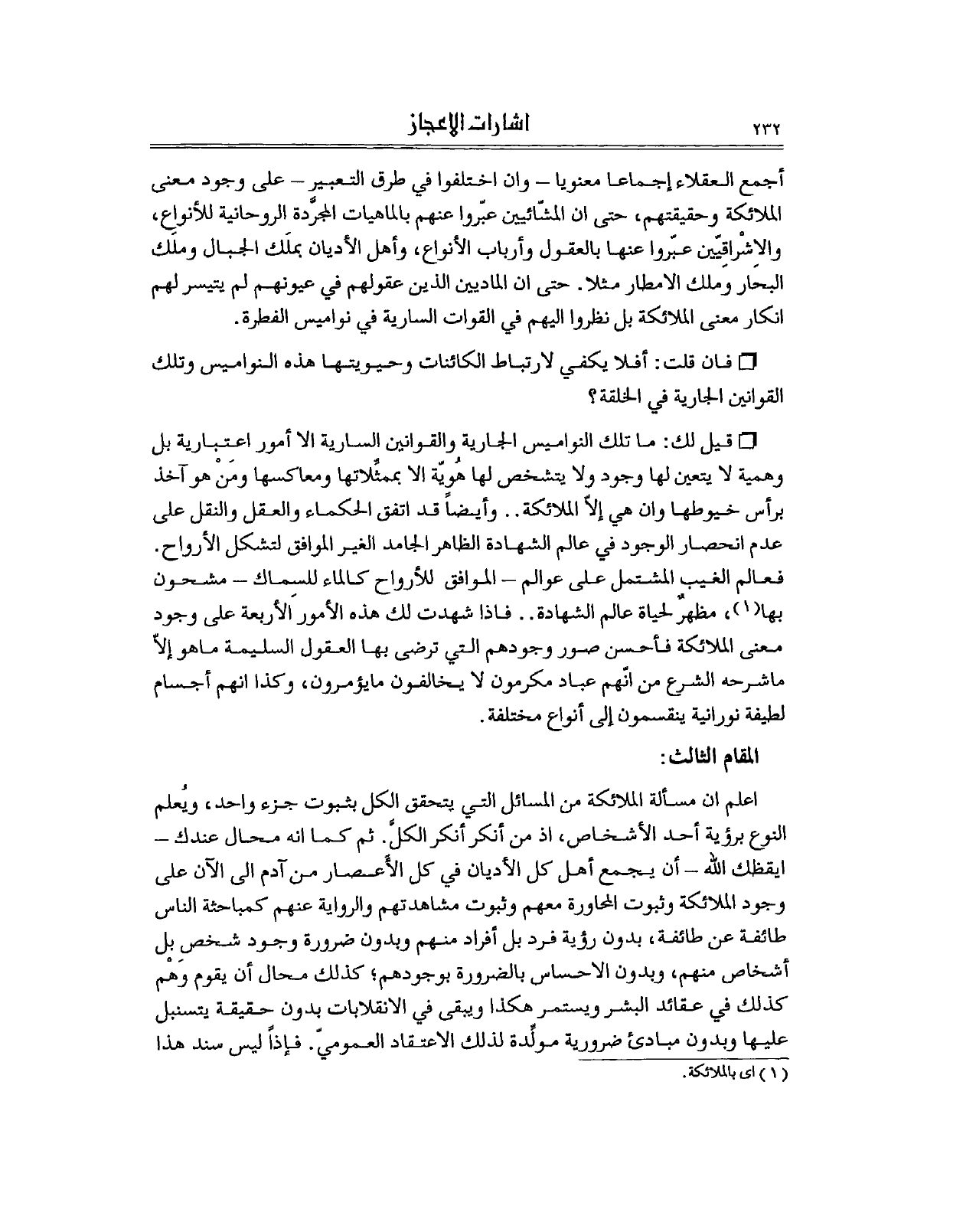 اعلم ان مسألة الملائكة من المسائل التي يتحقق الكل بثبوت جزء واحد، ويُعلم النوع برؤية أحد الأشخاص، اذ من أنكر أنكر الكلَّ. ثم كما انه محال عندك - ايقظك الله - أن يجمع أهل كل الأديان في كل الأَعصار من آدم الى الآن على وجود الملائكة وثبوت المحاورة معهم وثبوت مشاهدتهم والرواية عنهم كمباحثة الناس طائفة عن طائفة، بدون رؤية فرد بل أفراد منهم وبدون ضرورة وجود شخص بل أشخاص منهم، وبدون الاحساس بالضرورة بوجودهم؛ كذلك محال أن يقوم وَهْم كذلك في عقائد البشر ويستمر هكذا ويبقى في الانقلابات بدون حقيقة يتسنبل عليها وبدون مبادئ ضرورية مولِّدة لذلك الاعتقاد العموميّ. فإذاً ليس سند هذا