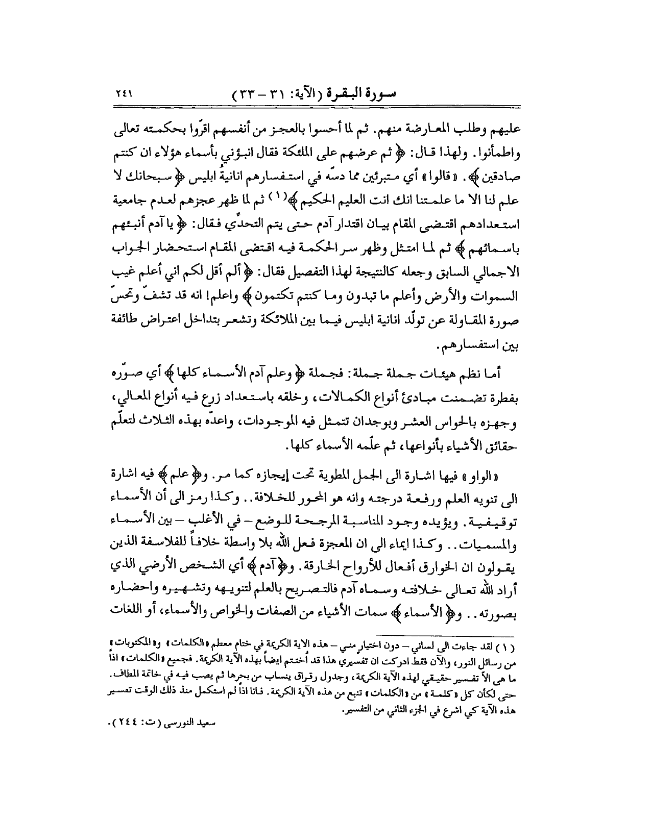 1 لقد جاءت الى لساني - دون اختيارٍ مني- هذه الآية الكريمة في ختام معظم "الكلمات " و "المكتوبات " من رسائل النور، والآن فقط ادركت ان تفسيري هذا قد اُختتم ايضاً بهذه الآية الكريمة. فجميع "الكلمات " اذاً ما هي الاّ تفسير حقيقي لهذه الآية الكريمة، وجدول رقراق ينساب من بحرها ثم يصب فيه في خاتمة المطاف. حتى لكأن كل " كلمة " من "الكلمات " تنبع من هذه الآية الكريمة. فانا اذاً لم استكمل منذ ذلك الوق تفسير هذه الآية كي اشرع في الجزء الثاني من التفسير.