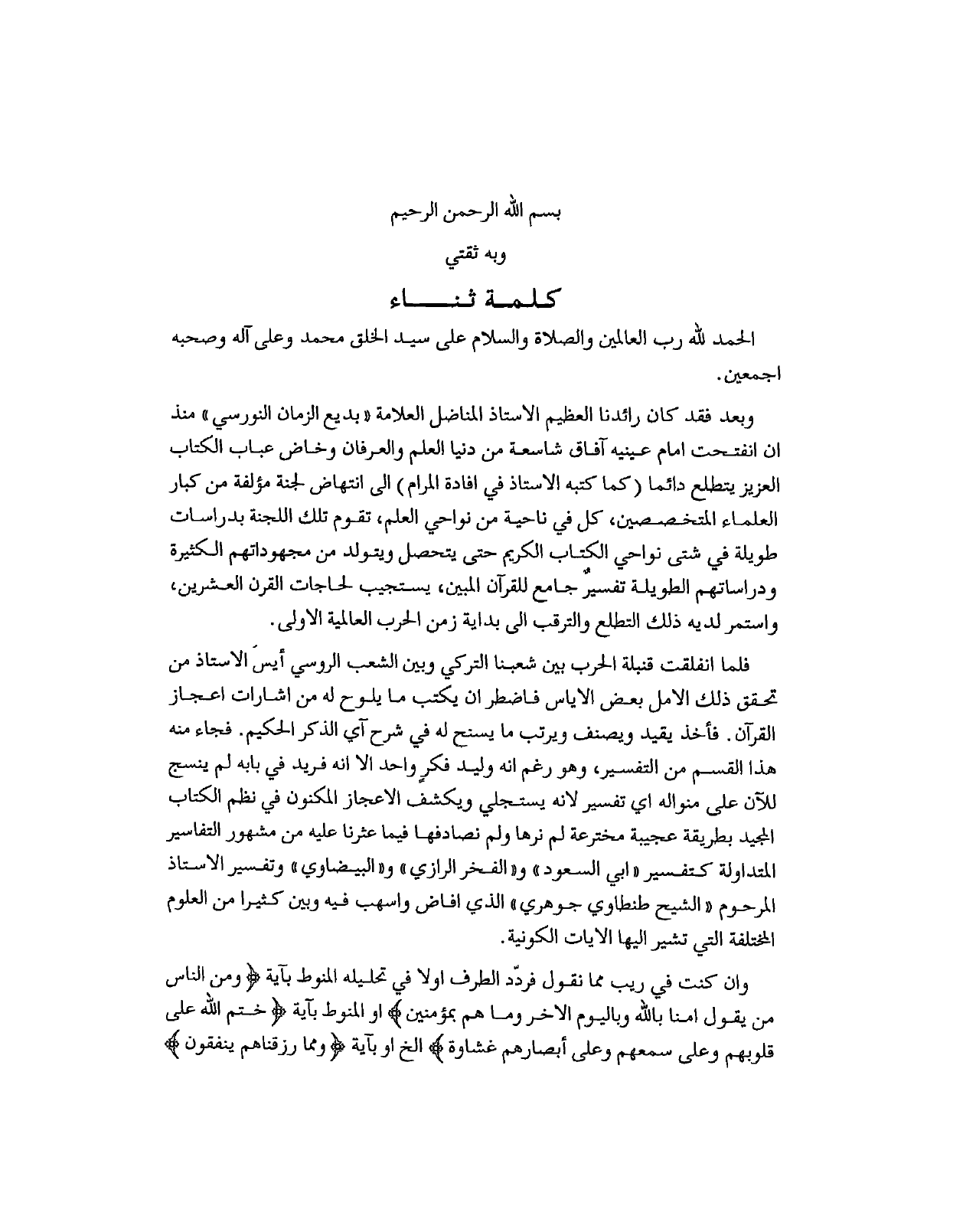 وبعد فقد كان رائدنا العظيم الاستاذ المناضل العلامة "بديع الزمان النورسي" منذ ان تفتحت امام عينيه آفاق شاسعة من دنيا العلم والعرفان وخاض عباب الكتاب العزيز يتطلع دائما (كما كتبه الاستاذ في افادة المرام) الى انتهاض لجنة مؤلفة من كبار العلماء المتخصصين، كل في ناحية من نواحي العلم، تقوم تلك اللجنة بدراسات طويلة في شتى نواحي الكتاب الكريم حتى يتحصل ويتولد من محهوداتهم الكثيرة ودراساتهم الطويلة تفسيرٌ جامع للقرآن المبين، يستجيب لحاجات القرن العشرين، واستمر لديه ذلك التطلع والترقب الى بداية زمن الحرب العالمية الاولى.