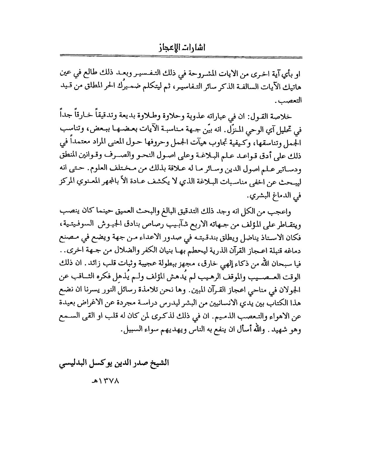واعجب من الكل انه وجد ذلك التدقيق البالغ والبحث العميق حينما كان ينصب ويتقاطر على المؤلف من جهاته الاربع شابيب رصاص بنادق الجيوش السوفيتية، فكان الاستاذ يناضل ويطلق بندقيته في صدور الاعداء من جهة ويضع في مصنع دماغه قنبلة اعجاز القرآن الذرية ليحطم بها بنيان الكفر والضلال من جهة اخرى فيا سبحان الله من ذكاء الهي خارق، مجهز ببطولة عجيبة وثبات قلب زائد. ان ذلك الوقت العصيب والموقف الرهيب لم يُدهش المؤلف ولم يُذهِل فكره الثاقب عن الجولان في مناحي اعجاز القرآن المبين. وها نحن تلامذة رسائل النور يسرنا ان نضع هذا الكتاب بين يدي الانسانيين من البشر ليدرس دراسة مجردة عن الاغراض بعيدة عن الاهواء والتعصب الذميم. ان في ذلك لذكرى لمن كان له قلب او القى السمع وهو شهيد. والله أسأل ان ينفع به الناس ويهديهم سواء السبيل.