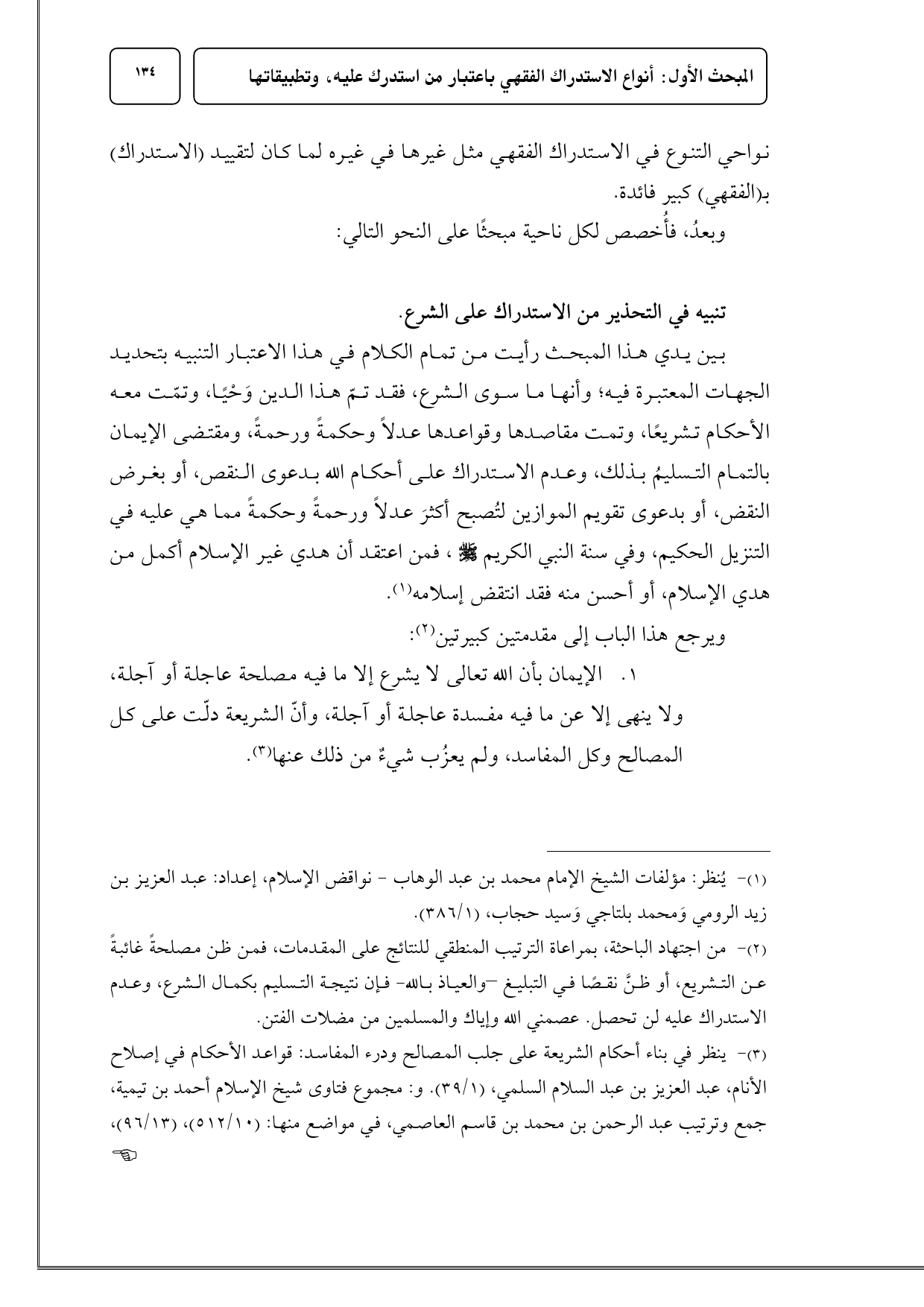 (¬2) من اجتهاد الباحثة، بمراعاة الترتيب المنطقي للنتائج على المقدمات، فمن ظن مصلحةً غائبةً عن التشريع، أو ظنَّ نقصًا في التبليغ - والعياذ بالله - فإن نتيجة التسليم بكمال الشرع، وعدم الاستدراك عليه لن تحصل. عصمني الله وإياك والمسلمين من مضلات الفتن.