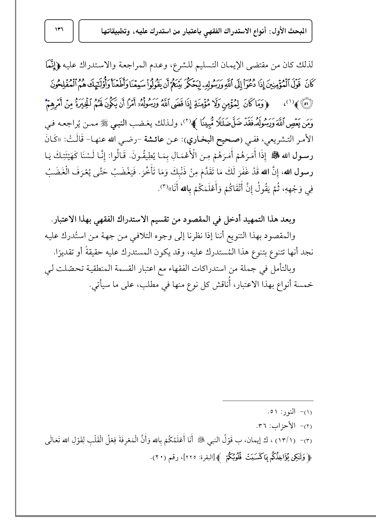 لذلك كان من مقتضى الإيمان التسليم للشرع، وعدم المراجعة والاستدراك عليه {إِنَّمَا كَانَ قَوْلَ الْمُؤْمِنِينَ إِذَا دُعُوا إِلَى اللَّهِ وَرَسُولِهِ لِيَحْكُمَ بَيْنَهُمْ أَنْ يَقُولُوا سَمِعْنَا وَأَطَعْنَا وَأُولَئِكَ هُمُ الْمُفْلِحُونَ (51)} (¬1)، {وَمَا كَانَ لِمُؤْمِنٍ وَلَا مُؤْمِنَةٍ إِذَا قَضَى اللَّهُ وَرَسُولُهُ أَمْرًا أَنْ يَكُونَ لَهُمُ الْخِيَرَةُ مِنْ أَمْرِهِمْ وَمَنْ يَعْصِ اللَّهَ وَرَسُولَهُ فَقَدْ ضَلَّ ضَلَالًا مُبِينًا} (¬2)، ولذلك يغضب النبي - صلى الله عليه وسلم - ممن يُراجعه في الأمر التشريعي، ففي (صحيح البخاري): عن عائشة - رضي الله عنها - قَالَتْ: «كَانَ رسول الله - صلى الله عليه وسلم - إِذَا أَمَرَهُمْ أَمَرَهُمْ مِن الْأَعْمَالِ بِمَا يُطِيقُونَ. قَالُوا: إِنَّا لَسْنَا كَهَيْئَتِكَ يَا رسول الله، إِنَّ الله قَدْ غَفَرَ لَكَ مَا تَقَدَّمَ مِنْ ذَنْبِكَ وَمَا تَأَخَّرَ. فَيَغْضَبُ حَتَّى يُعْرَفَ الْغَضَبُ فِي وَجْهِهِ، ثُمَّ يَقُولُ إِنَّ أَتْقَاكُمْ وَأَعْلَمَكُمْ بِالله أَنَا» (¬3).