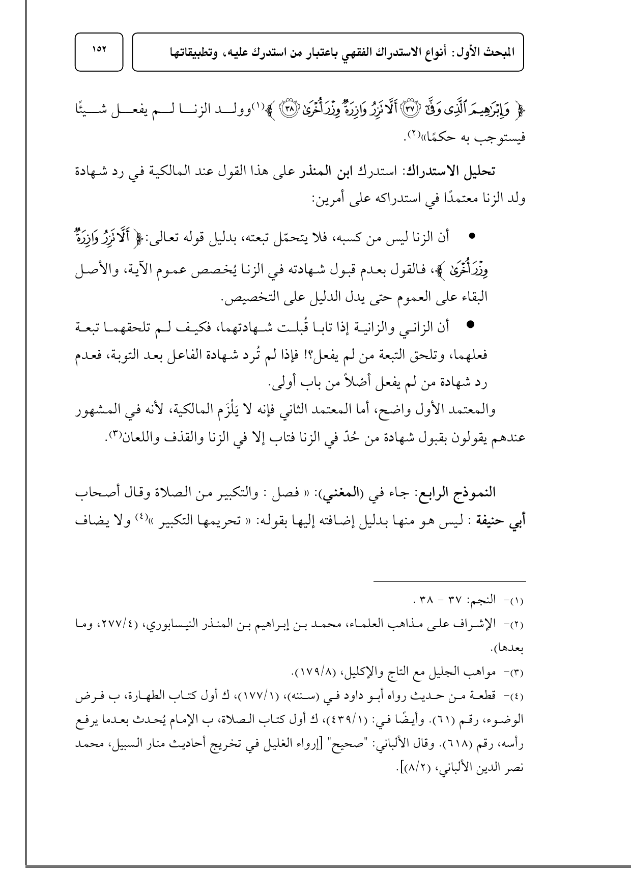 النموذج الرابع: جاء في (المغني): «فصل: والتكبير من الصلاة وقال أصحاب أبي حنيفة: ليس هو منها بدليل إضافته إليها بقوله: «تحريمها التكبير» (¬4) ولا يضاف