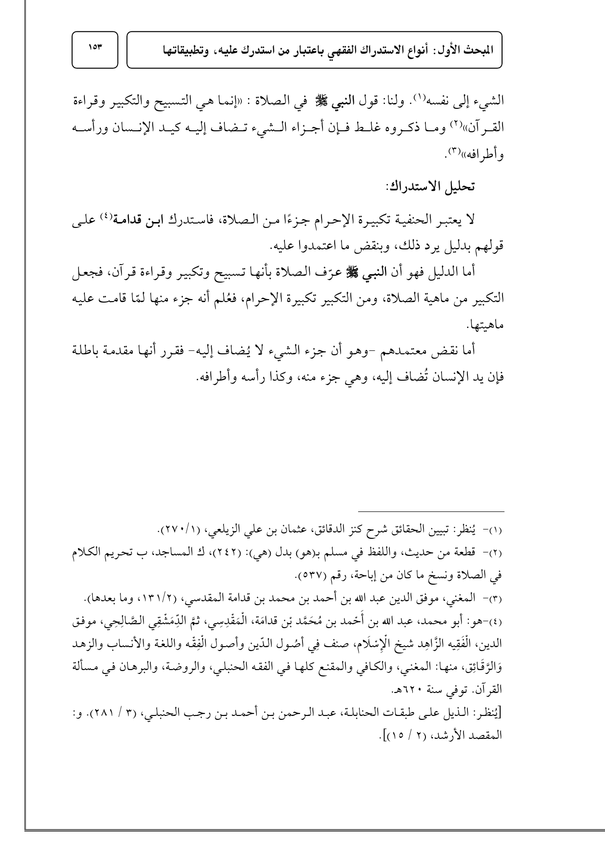 لا يعتبر الحنفية تكبيرة الإحرام جزءًا من الصلاة، فاستدرك ابن قدامة (¬4) على قولهم بدليل يرد ذلك، وبنقض ما اعتمدوا عليه.