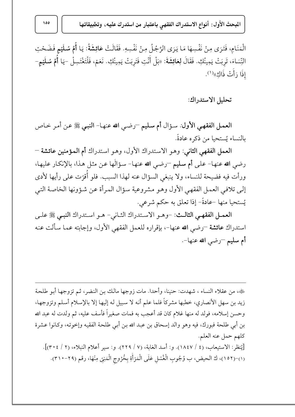 العمل الفقهي الأول: سؤال أم سليم - رضي الله عنها - النبي - صلى الله عليه وسلم - عن أمر خاص بالنساء يُستحيا من ذكره عادةً.