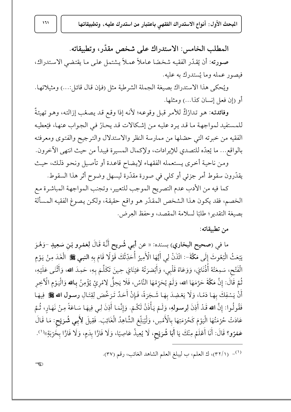 ما في (صحيح البخاري) بسنده: «عن أبي شُريح أَنَّهُ قَالَ لِعَمْرِو بْنِ سَعِيدٍ - وَهُوَ يَبْعَثُ الْبُعُوثَ إِلَى مَكَّةَ -: ائْذَنْ لِي أَيُّهَا الْأَمِيرُ أُحَدِّثْكَ قَوْلًا قَامَ بِهِ النبي - صلى الله عليه وسلم - الْغَدَ مِنْ يَوْمِ الْفَتْحِ، سَمِعَتْهُ أُذُنَايَ، وَوَعَاهُ قَلْبِي، وَأَبْصَرَتْهُ عَيْنَايَ حِينَ تَكَلَّمَ بِهِ، حَمِدَ الله، وَأَثْنَى عَلَيْهِ، ثُمَّ قَالَ: إِنَّ مَكَّةَ حَرَّمَهَا الله، وَلَمْ يُحَرِّمْهَا النَّاسُ، فَلَا يَحِلُّ لِامْرِئٍ يُؤْمِنُ بِالله وَالْيَوْمِ الْآخِرِ أَنْ يَسْفِكَ بِهَا دَمًا، وَلَا يَعْضِدَ بِهَا شَجَرَةً، فَإِنْ أَحَدٌ تَرَخَّصَ لِقِتَالِ رسول الله - صلى الله عليه وسلم - فِيهَا فَقُولُوا: إِنَّ الله قَدْ أَذِنَ لِرسولهِ، وَلَمْ يَأْذَنْ لَكُمْ. وَإِنَّمَا أَذِنَ لِي فِيهَا سَاعَةً مِنْ نَهَارٍ، ثُمَّ عَادَتْ حُرْمَتُهَا الْيَوْمَ كَحُرْمَتِهَا بِالْأَمْسِ، وَلْيُبَلِّغ الشَّاهِدُ الْغَائِبَ. فَقِيلَ لِأَبِي شُرَيْحٍ: مَا قَالَ عَمْرٌو؟ قَالَ: أَنَا أَعْلَمُ مِنْكَ يَا أَبَا شُرَيْحٍ، لَا يُعِيذُ عَاصِيًا، وَلَا فَارًّا بِدَمٍ، وَلَا فَارًّا بِخَرْبَةٍ» (¬1).