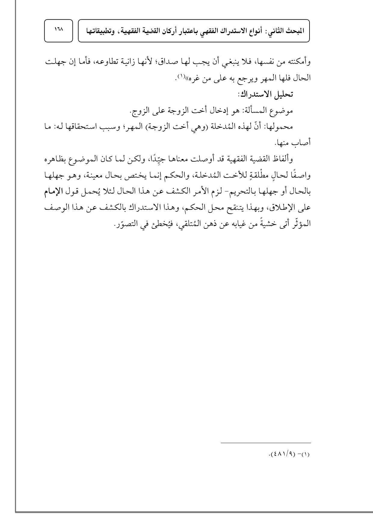 وألفاظ القضية الفقهية قد أوصلت معناها جيِّدًا، ولكن لما كان الموضوع بظاهره واصفًا لحالٍ مطْلقةٍ للأخت المُدخلة، والحكم إنما يختص بحال معينة، وهو جهلها بالحال أو جهلها بالتحريم - لزم الأمر الكشف عن هذا الحال لئلا يُحمل قول الإمام على الإطلاق، وبهذا يتنقح محل الحكم، وهذا الاستدراك بالكشف عن هذا الوصف المؤثّر أتى خشيةً من غيابه عن ذهن المُتلقي، فيُخطئ في التصوّر.