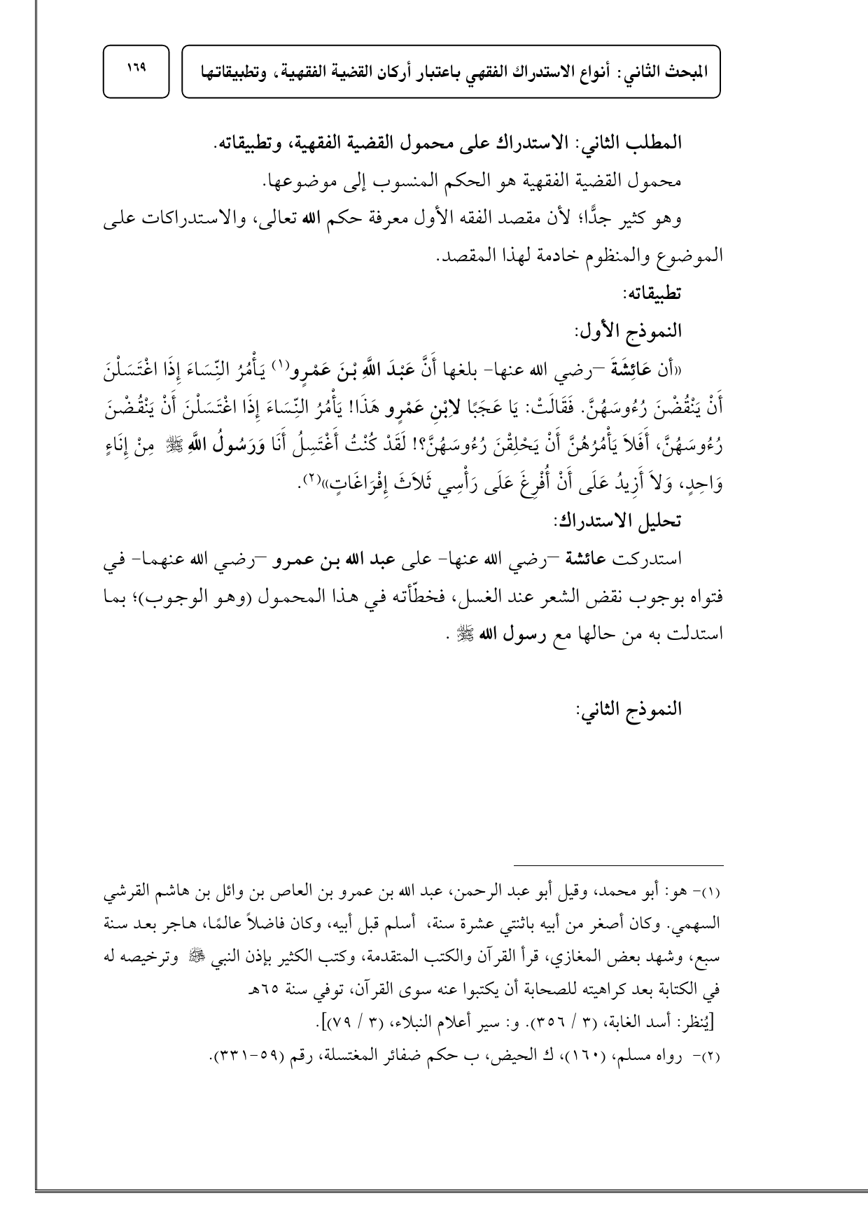 استدركت عائشة - رضي الله عنها - على عبد الله بن عمرو - رضي الله عنهما - في فتواه بوجوب نقض الشعر عند الغسل، فخطّأته في هذا المحمول (وهو الوجوب)؛ بما استدلت به من حالها مع رسول الله - صلى الله عليه وسلم -.