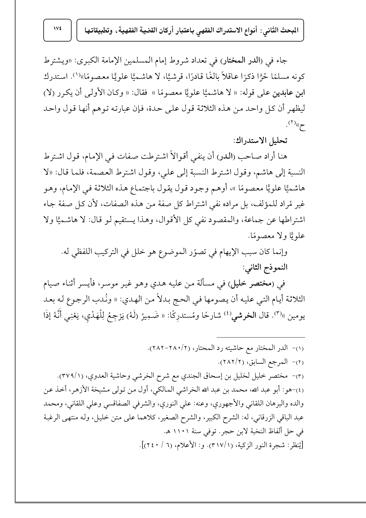 جاء في (الدر المختار) في تعداد شروط إمام المسلمين الإمامة الكبرى: «ويشترط كونه مسلمًا حُرًّا ذكرًا عاقلاً بالغًا قادرًا، قرشيًّا، لا هاشميًّا علويًّا معصومًا» (¬1). استدرك ابن عابدين على قوله: «لا هاشميًّا علويًّا معصومًا» فقال: «وكان الأولى أن يكرر (لا) ليظهر أن كل واحد من هذه الثلاثة قول على حدة، فإن عبارته توهم أنها قول واحد ح» (¬2).