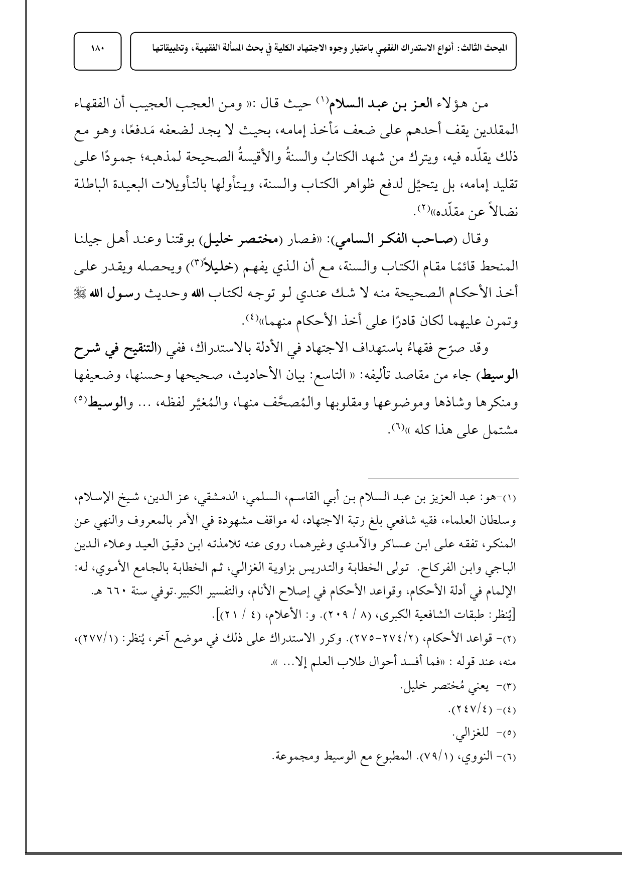 وقد صرّح فقهاءُ باستهداف الاجتهاد في الأدلة بالاستدراك، ففي (التنقيح في شرح الوسيط) جاء من مقاصد تأليفه: «التاسع: بيان الأحاديث، صحيحها وحسنها، وضعيفها ومنكرها وشاذها وموضوعها ومقلوبها والمُصحَّف منها، والمُغيَّر لفظه، ... والوسيط (¬5) مشتمل على هذا كله» (¬6).
