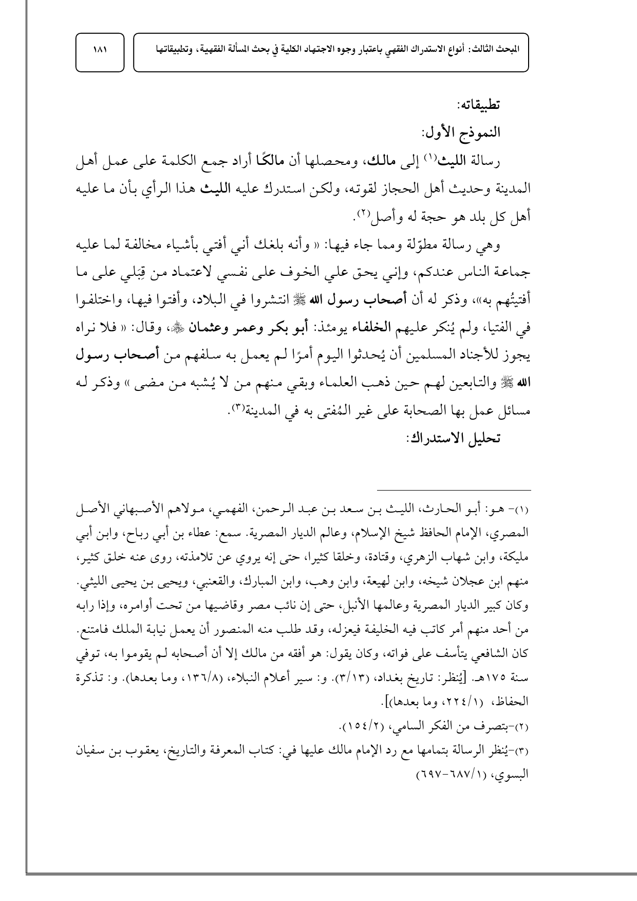 رسالة الليث (¬1) إلى مالك، ومحصلها أن مالكًا أراد جمع الكلمة على عمل أهل المدينة وحديث أهل الحجاز لقوته، ولكن استدرك عليه الليث هذا الرأي بأن ما عليه أهل كل بلد هو حجة له وأصل (¬2).