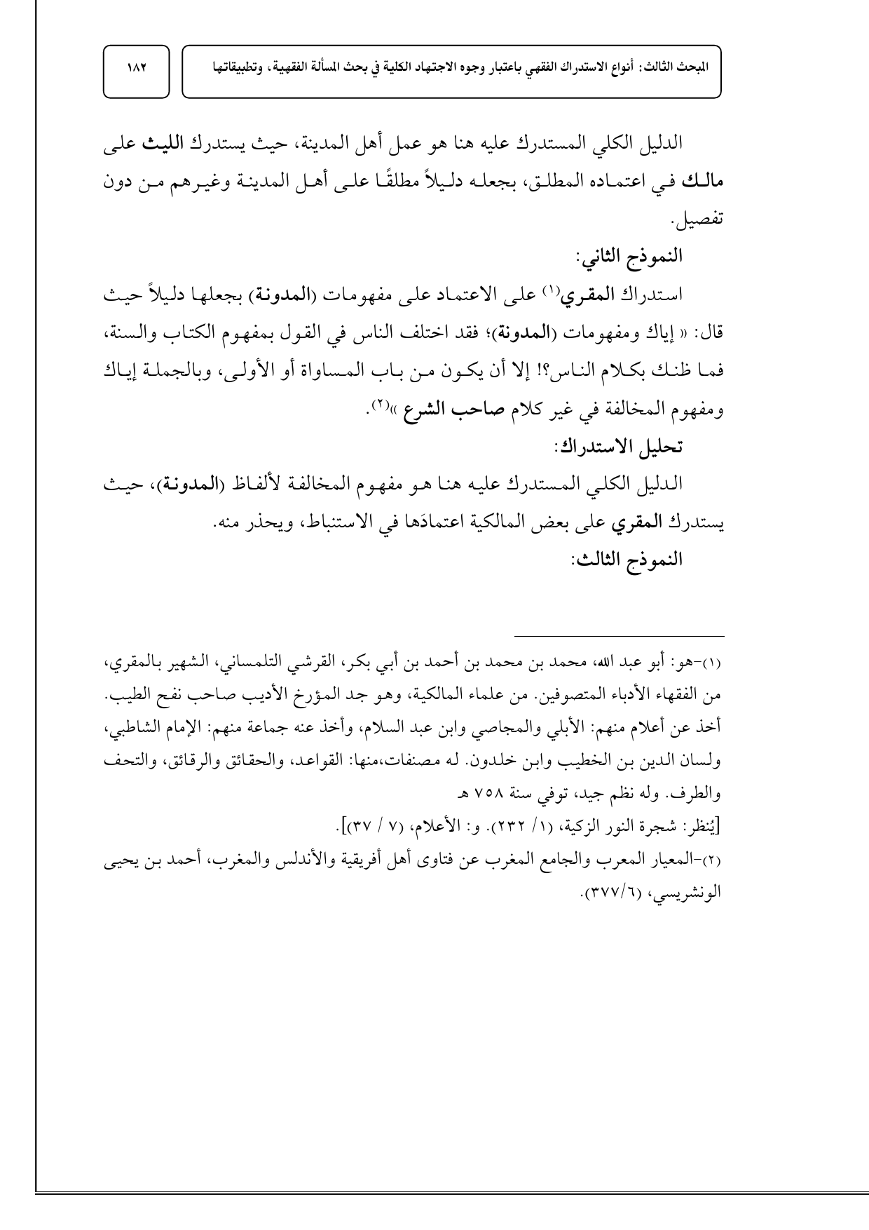 الدليل الكلي المستدرك عليه هنا هو مفهوم المخالفة لألفاظ (المدونة)، حيث يستدرك المقري على بعض المالكية اعتمادَها في الاستنباط، ويحذر منه.