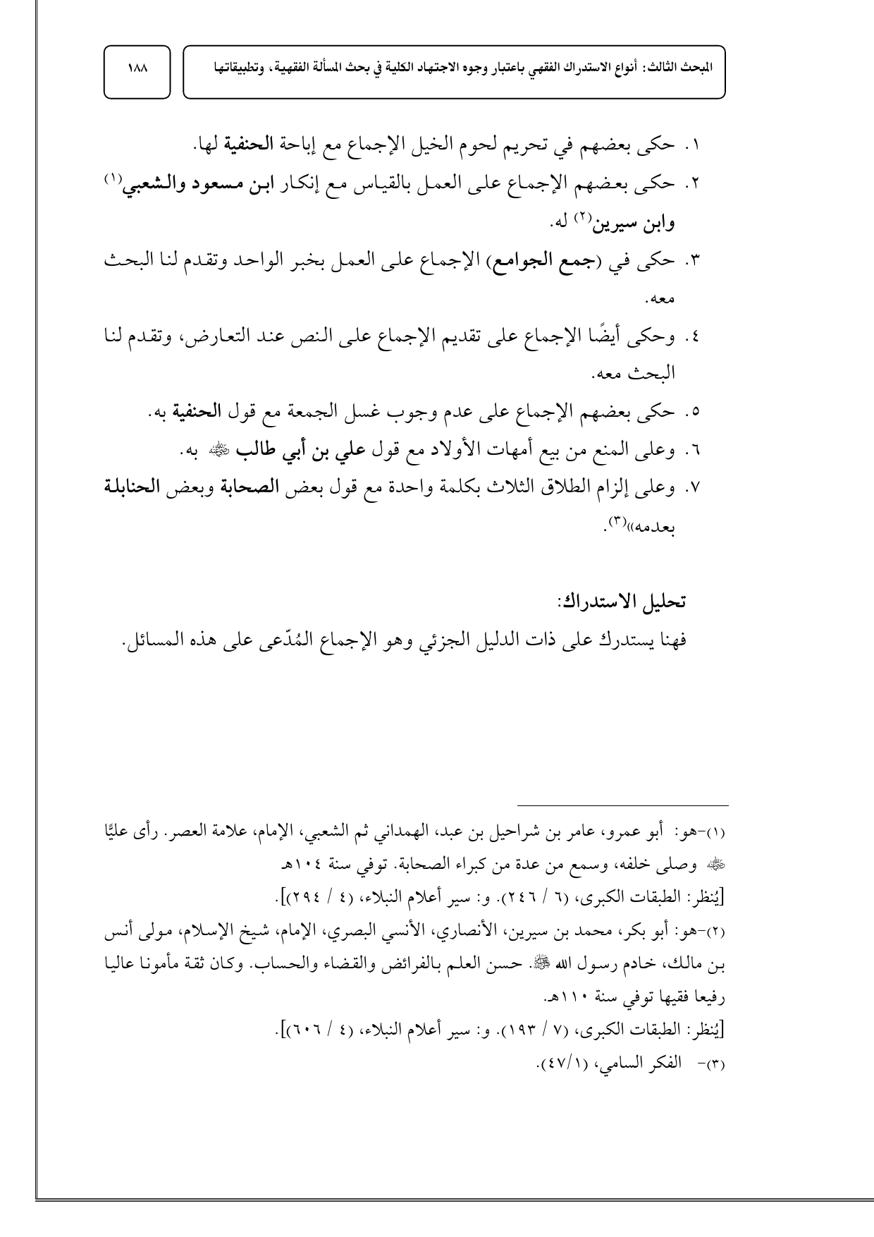 (¬2) هو: أبو بكر، محمد بن سيرين، الأنصاري، الأنسي البصري، الإمام، شيخ الإسلام، مولى أنس بن مالك، خادم رسول الله - صلى الله عليه وسلم -. حسن العلم بالفرائض والقضاء والحساب. وكان ثقة مأمونا عاليا رفيعا فقيها توفي سنة 110 هـ.