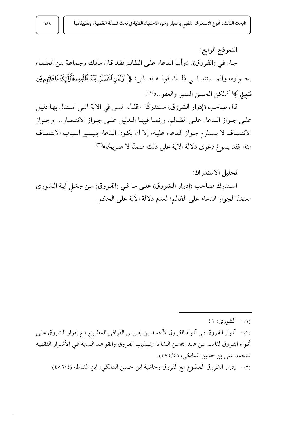 استدرك صاحب (إدرار الشروق) على ما في (الفروق) من جعْلِ آية الشورى معتمَدًا لجواز الدعاء على الظالم؛ لعدم دلالة الآية على الحكم.