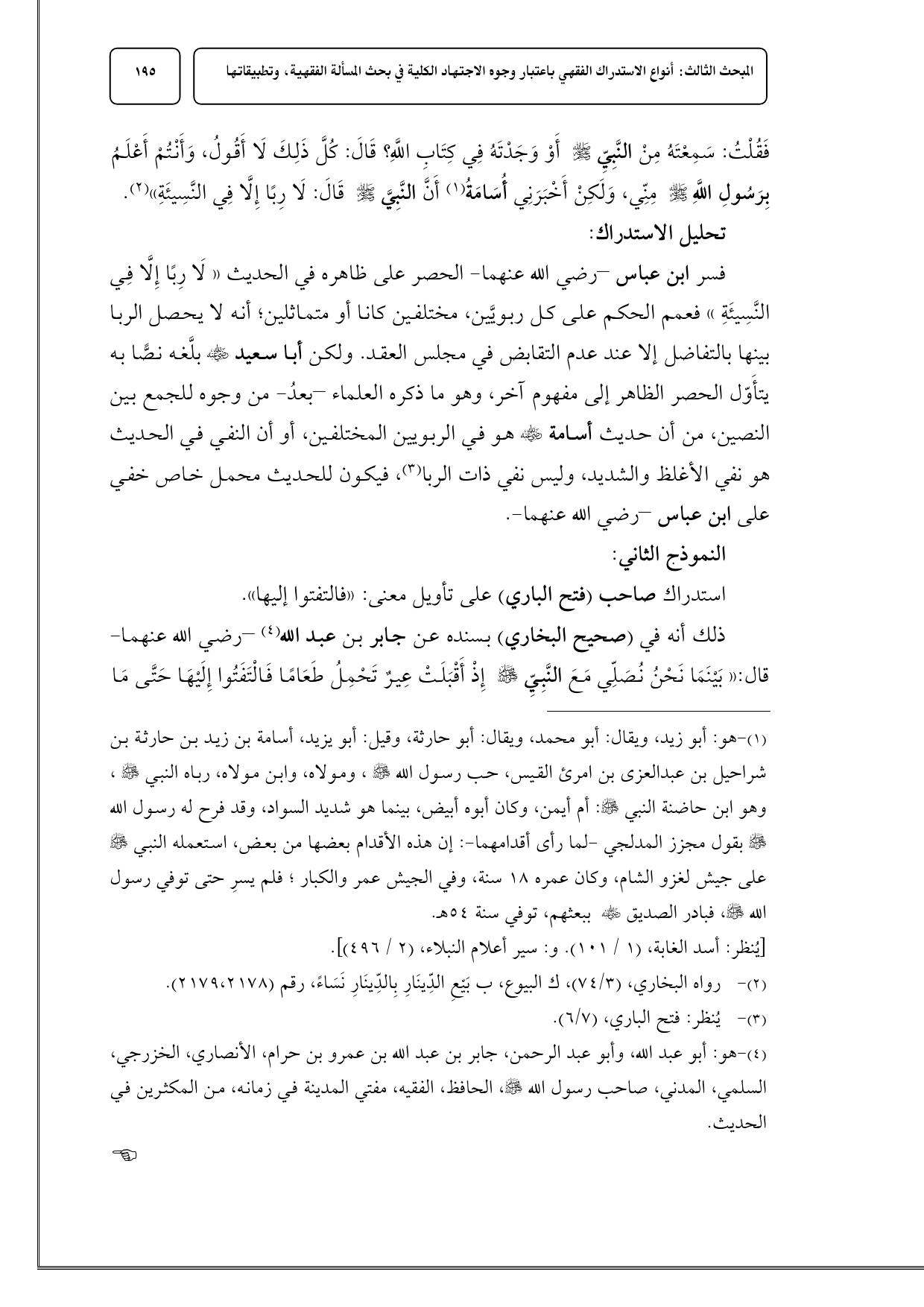 فسر ابن عباس - رضي الله عنهما - الحصر على ظاهره في الحديث «لَا رِبًا إِلَّا فِي النَّسِيئَةِ» فعمم الحكم على كل ربويَّين، مختلفين كانا أو متماثلين؛ أنه لا يحصل الربا بينها بالتفاضل إلا عند عدم التقابض في مجلس العقد. ولكن أبا سعيد - رضي الله عنه - بلَّغه نصًّا به يتأَوّل الحصر الظاهر إلى مفهوم آخر، وهو ما ذكره العلماء - بعدُ - من وجوه للجمع بين النصين، من أن حديث أسامة - رضي الله عنه - هو في الربويين المختلفين، أو أن النفي في الحديث هو نفي الأغلظ والشديد، وليس نفي ذات الربا (¬3)، فيكون للحديث محمل خاص خفي على ابن عباس - رضي الله عنهما -.
