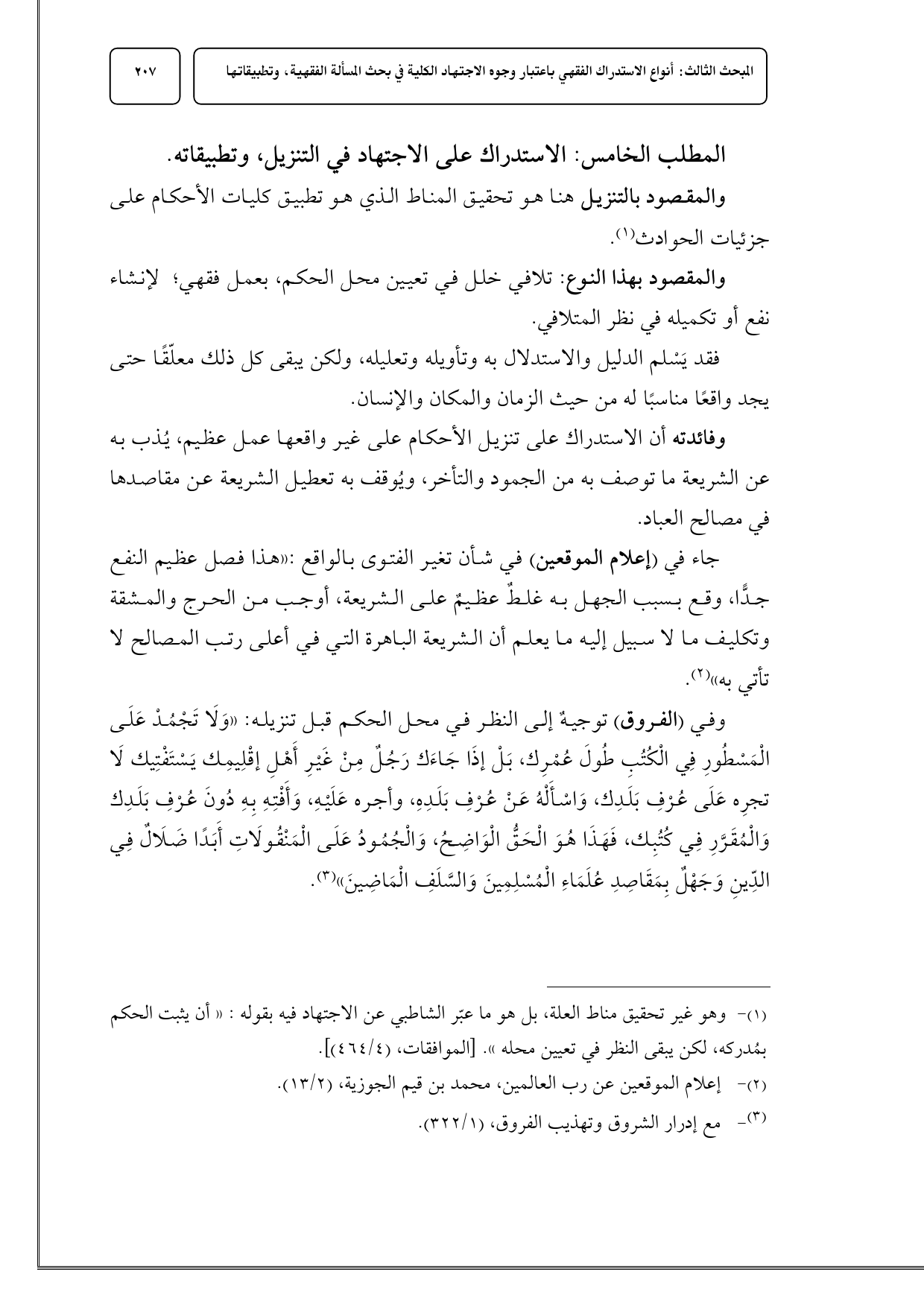 وفي (الفروق) توجيهٌ إلى النظر في محل الحكم قبل تنزيله: «وَلَا تَجْمُدْ عَلَى الْمَسْطُورِ فِي الْكُتُبِ طُولَ عُمْرِك، بَلْ إذَا جَاءَك رَجُلٌ مِنْ غَيْرِ أَهْلِ إقْلِيمِك يَسْتَفْتِيك لَا تجرِه عَلَى عُرْفِ بَلَدِك، وَاسْأَلْهُ عَنْ عُرْفِ بَلَدِهِ، وأجره عَلَيْهِ، وَأَفْتِهِ بِهِ دُونَ عُرْفِ بَلَدِك وَالْمُقَرَّرِ فِي كُتُبِك، فَهَذَا هُوَ الْحَقُّ الْوَاضِحُ، وَالْجُمُودُ عَلَى الْمَنْقُولَاتِ أَبَدًا ضَلَالٌ فِي الدِّينِ وَجَهْلٌ بِمَقَاصِدِ عُلَمَاءِ الْمُسْلِمِينَ وَالسَّلَفِ الْمَاضِينَ» (¬3).