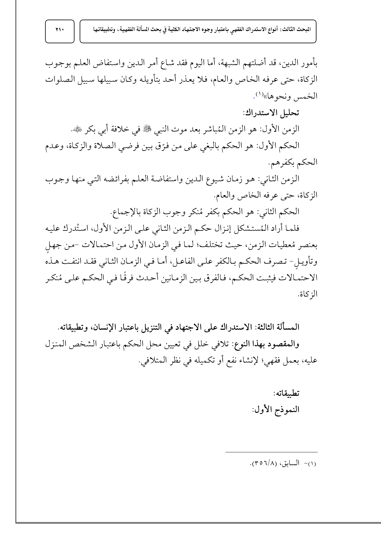 فلما أراد المُستشكل إنزال حكم الزمن الثاني على الزمن الأول، استُدرك عليه بعنصر مُعطيات الزمن، حيث تختلف؛ لما في الزمان الأول من احتمالات - من جهلٍ وتأويلٍ - تصرف الحكم بالكفر على الفاعل، أما في الزمان الثاني فقد انتفت هذه الاحتمالات فيثبت الحكم، فالفرق بين الزمانين أحدث فرقًا في الحكم على مُنكر الزكاة.