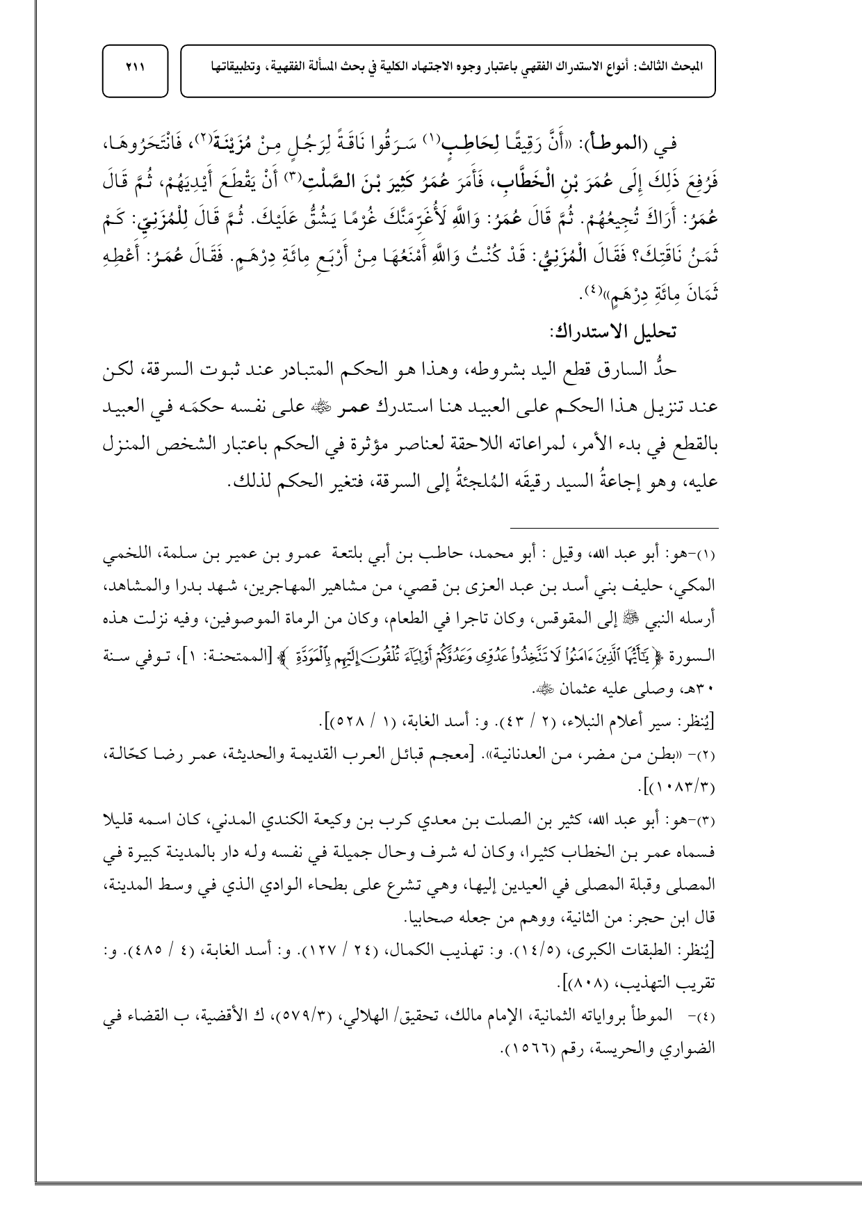 في (الموطأ): «أَنَّ رَقِيقًا لِحَاطِبٍ (¬1) سَرَقُوا نَاقَةً لِرَجُلٍ مِنْ مُزَيْنَةَ (¬2)، فَانْتَحَرُوهَا، فَرُفِعَ ذَلِكَ إِلَى عُمَرَ بْنِ الْخَطَّابِ، فَأَمَرَ عُمَرُ كَثِيرَ بْنَ الصَّلْتِ (¬3)