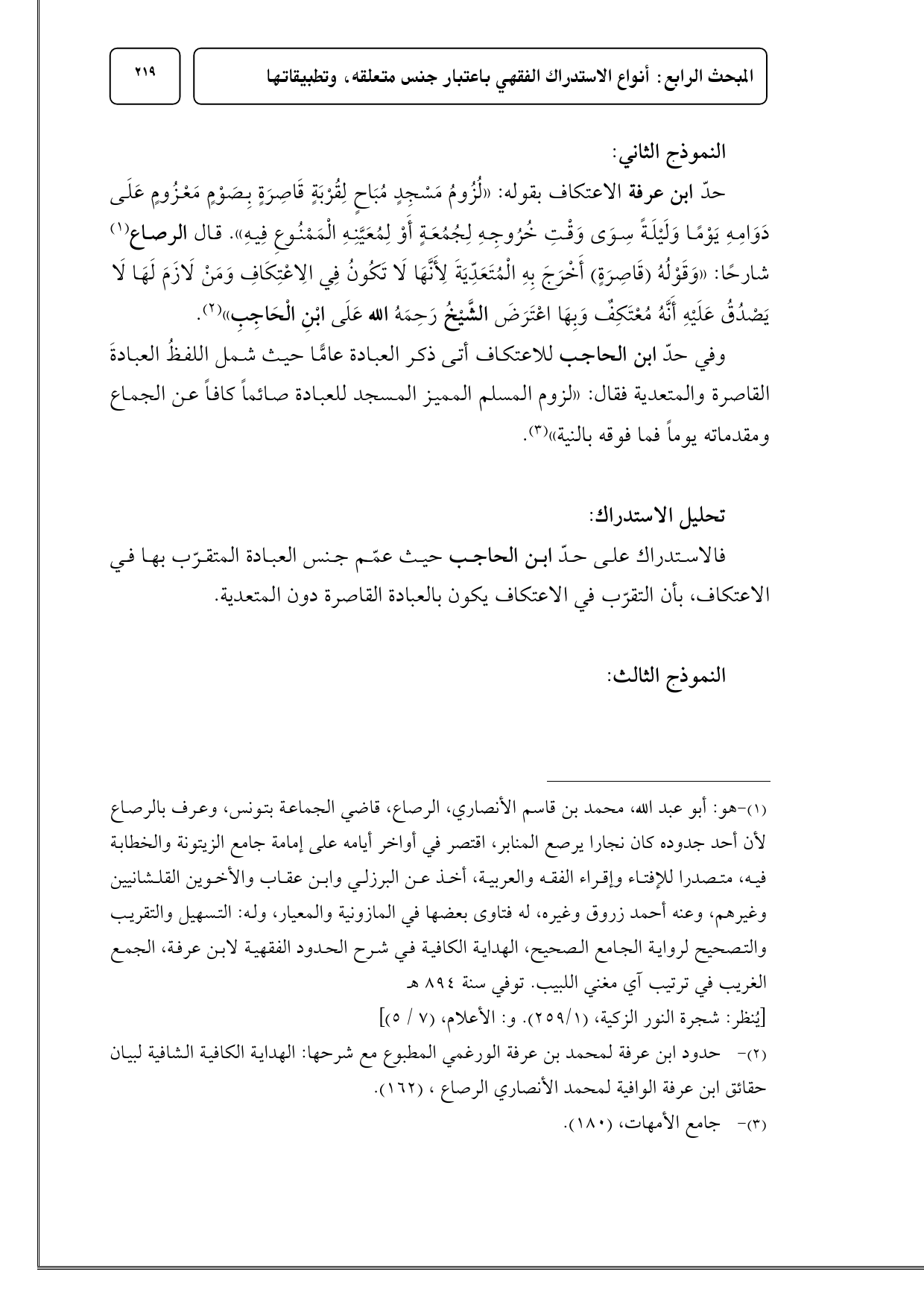 وفي حدّ ابن الحاجب للاعتكاف أتى ذكر العبادة عامًّا حيث شمل اللفظُ العبادةَ القاصرة والمتعدية فقال: «لزوم المسلم المميز المسجد للعبادة صائماً كافاً عن الجماع ومقدماته يوماً فما فوقه بالنية» (¬3).