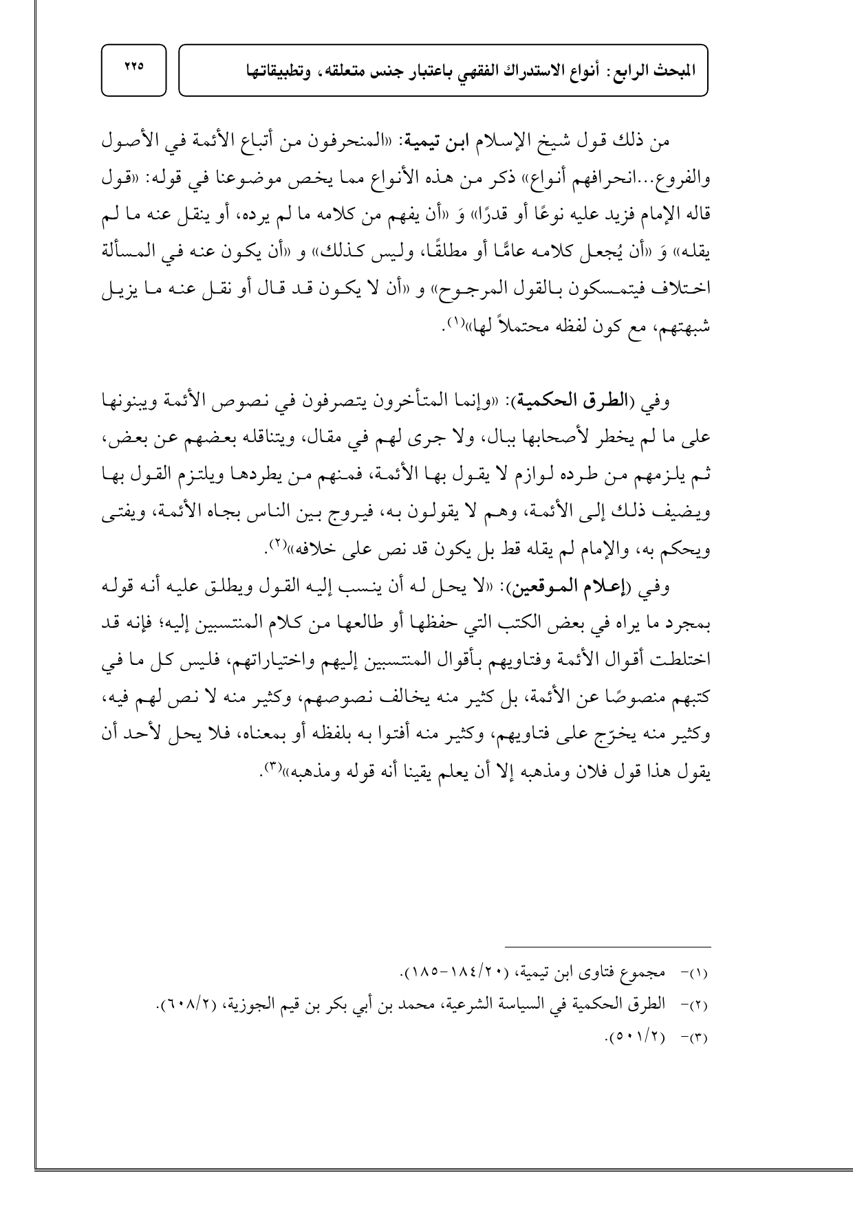 من ذلك قول شيخ الإسلام ابن تيمية: «المنحرفون من أتباع الأئمة في الأصول والفروع ... انحرافهم أنواع» ذكر من هذه الأنواع مما يخص موضوعنا في قوله: «قول قاله الإمام فزيد عليه نوعًا أو قدرًا» وَ «أن يفهم من كلامه ما لم يرده، أو ينقل عنه ما لم يقله» وَ «أن يُجعل كلامه عامًّا أو مطلقًا، وليس كذلك» و «أن يكون عنه في المسألة اختلاف فيتمسكون بالقول المرجوح» و «أن لا يكون قد قال أو نقل عنه ما يزيل شبهتهم، مع كون لفظه محتملاً لها» (¬1).
