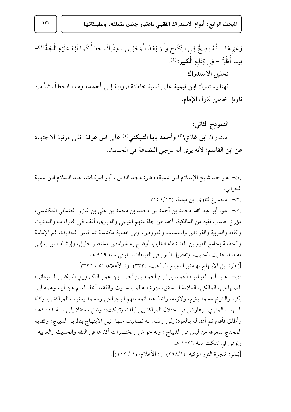 (¬4) هو: أبو العباس، أحمد بابا بن أحمد بن أحمد بن عمر التكروري التنبكتي السوداني، الصنهاجي، المالكي، العلامة المحقق، مؤرخ، عالم بالحديث والفقه، أخذ العلم عن أبيه وعمه أبي بكر، والشيخ محمد بغيع، ولازمه، وأخذ عنه أئمة منهم الرجراجي ومحمد يعقوب المراكشي، وكذا الشهاب المقري، وعارض في احتلال المراكشيين لبلدته (تنبكت)، وظل معتقلا إلى سنة 1004 هـ، وأطلق فأقام ثم أذن له بالعودة إلى وطنه. وتوفي في تنبكت سنة 1036 هـ.