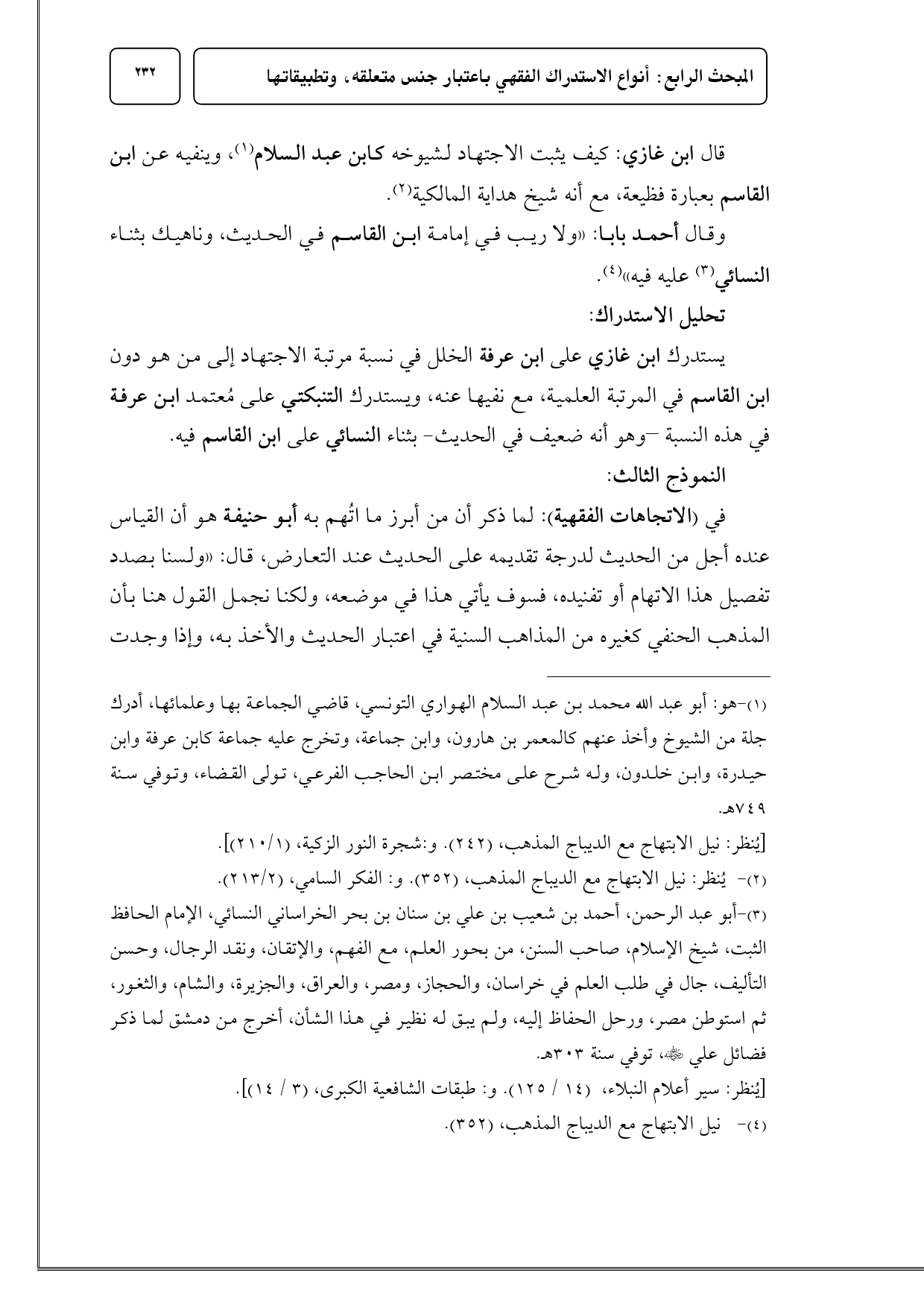 يستدرك ابن غازي على ابن عرفة الخلل في نسبة مرتبة الاجتهاد إلى من هو دون ابن القاسم في المرتبة العلمية، مع نفيها عنه، ويستدرك التنبكتي على مُعتمد ابن عرفة في هذه النسبة - وهو أنه ضعيف في الحديث - بثناء النسائي على ابن القاسم فيه.