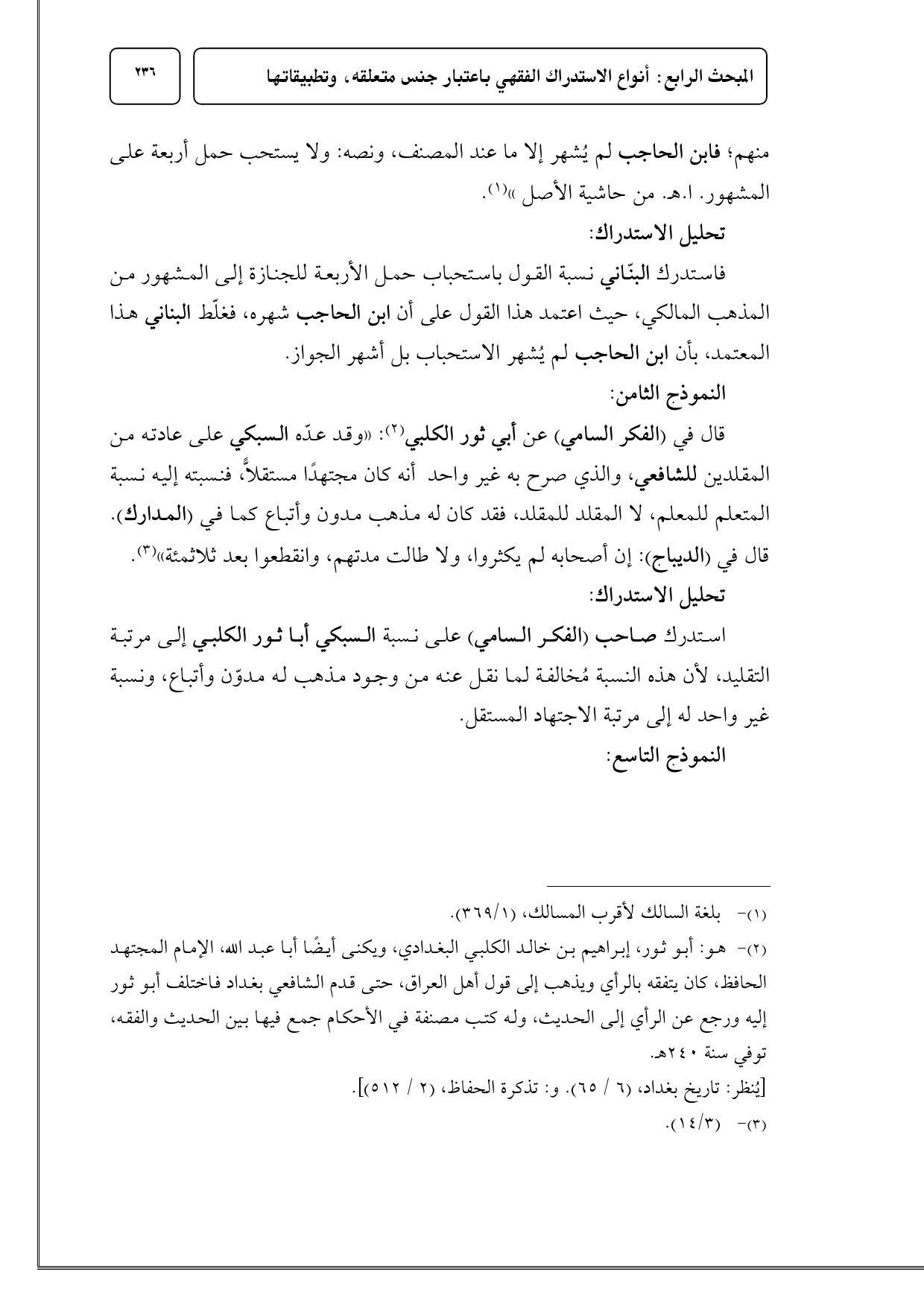 قال في (الفكر السامي) عن أبي ثور الكلبي (¬2): «وقد عدّه السبكي على عادته من المقلدين للشافعي، والذي صرح به غير واحد أنه كان مجتهدًا مستقلاًّ، فنسبته إليه نسبة المتعلم للمعلم، لا المقلد للمقلد، فقد كان له مذهب مدون وأتباع كما في (المدارك). قال في (الديباج): إن أصحابه لم يكثروا، ولا طالت مدتهم، وانقطعوا بعد ثلاثمئة» (¬3).