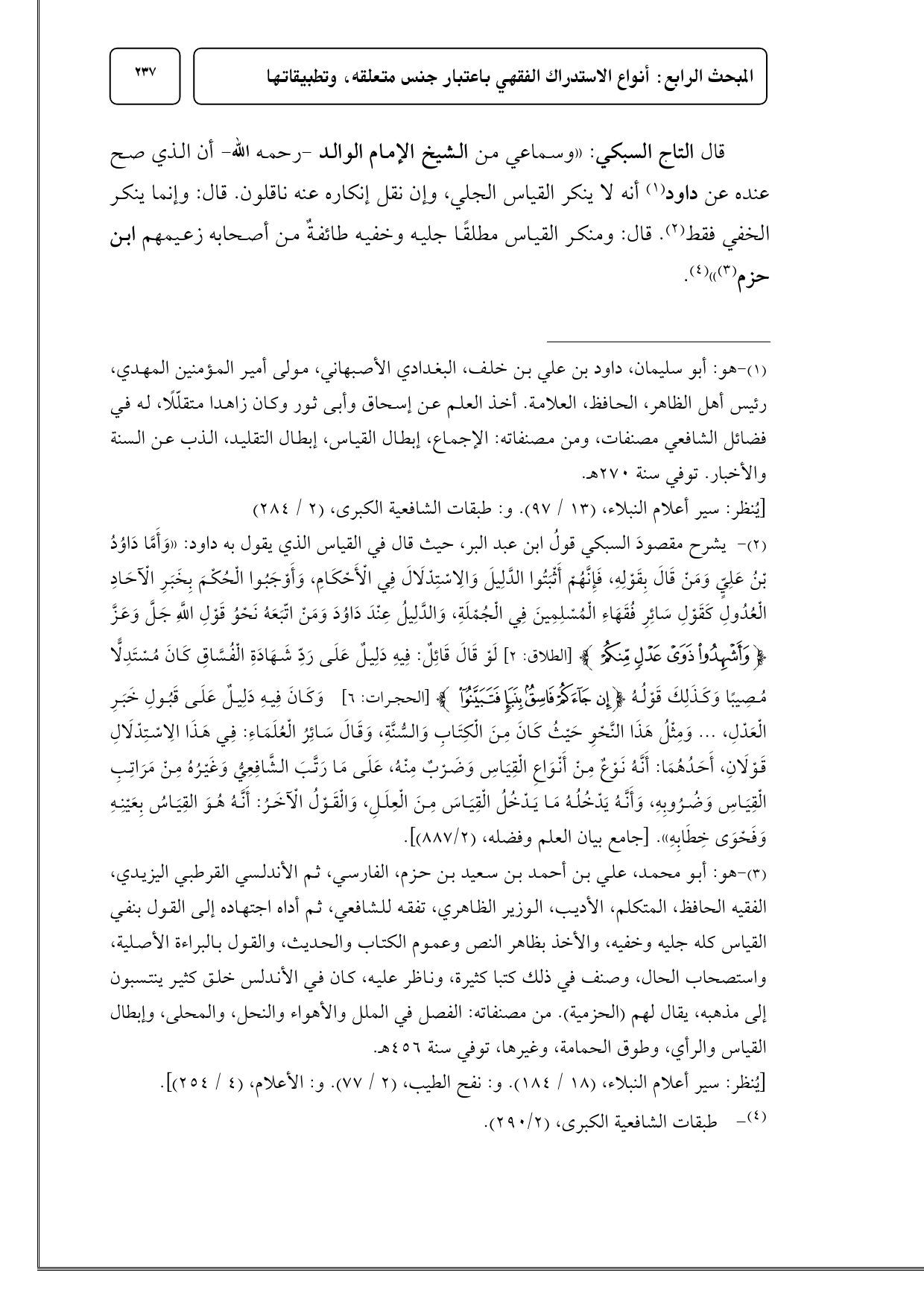 (¬2) يشرح مقصودَ السبكي قولُ ابن عبد البر، حيث قال في القياس الذي يقول به داود: «وَأَمَّا دَاوُدُ بْنُ عَلِيٍّ وَمَنْ قَالَ بِقَوْلِهِ، فَإِنَّهُمْ أَثْبَتُوا الدَّلِيلَ وَالِاسْتِدْلَالَ فِي الْأَحْكَامِ، وَأَوْجَبُوا الْحُكْمَ بِخَبَرِ الْآحَادِ الْعُدُولِ كَقَوْلِ سَائِرِ فُقَهَاءِ الْمُسْلِمِينَ فِي الْجُمْلَةِ، وَالدَّلِيلُ عِنْدَ دَاوُدَ وَمَنْ اتّبَعَهُ نَحْوُ قَوْلِ اللَّهِ جَلَّ وَعَزَّ {وَأَشْهِدُوا ذَوَيْ عَدْلٍ مِنْكُمْ} [الطلاق: 2] لَوْ قَالَ قَائِلٌ: فِيهِ دَلِيلٌ عَلَى رَدِّ شَهَادَةِ الْفُسَّاقِ كَانَ مُسْتَدِلًّا مُصِيبًا وَكَذَلِكَ قَوْلُهُ {إِنْ جَاءَكُمْ فَاسِقٌ بِنَبَإٍ فَتَبَيَّنُوا} [الحجرات: 6] وَكَانَ فِيهِ دَلِيلٌ عَلَى قَبُولِ خَبَرِ الْعَدْلِ، ... وَمِثْلُ هَذَا النَّحْوِ حَيْثُ كَانَ مِنَ الْكِتَابِ وَالسُّنَّةِ، وَقَالَ سَائِرُ الْعُلَمَاءِ: فِي هَذَا الِاسْتِدْلَالِ قَوْلَانِ، أَحَدُهُمَا: أَنَّهُ نَوْعٌ مِنْ أَنْوَاعِ الْقِيَاسِ وَضَرْبٌ مِنْهُ، عَلَى مَا رَتَّبَ الشَّافِعِيُّ وَغَيْرُهُ مِنْ مَرَاتِبِ الْقِيَاسِ وَضُرُوبِهِ، وَأَنَّهُ يَدْخُلُهُ مَا يَدْخُلُ الْقِيَاسَ مِنَ الْعِلَلِ، وَالْقَوْلُ الْآخَرُ: أَنَّهُ هُوَ القِيَاسُ بِعَيْنِهِ وَفَحْوَى خِطَابِهِ». [جامع بيان العلم وفضله، (2/ 887)].