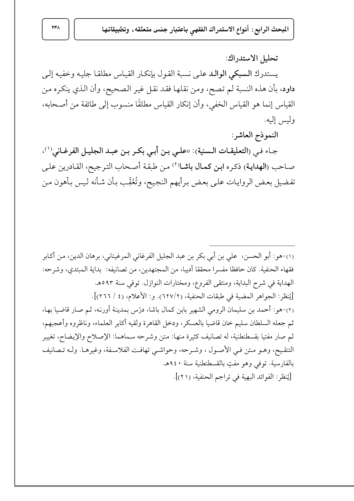(¬2) هو: أحمد بن سليمان الرومي الشهير بابن كمال باشا، درّس بمدينة أورنه، ثم صار قاضيا بها، ثم جعله السلطان سليم خان قاضيا بالعسكر، ودخل القاهرة ولقيه أكابر العلماء، وناظروه وأعجبهم، ثم صار مفتيا بقسطنطنية، وتوفي وهو مفتٍ بها سنة 940 هـ.