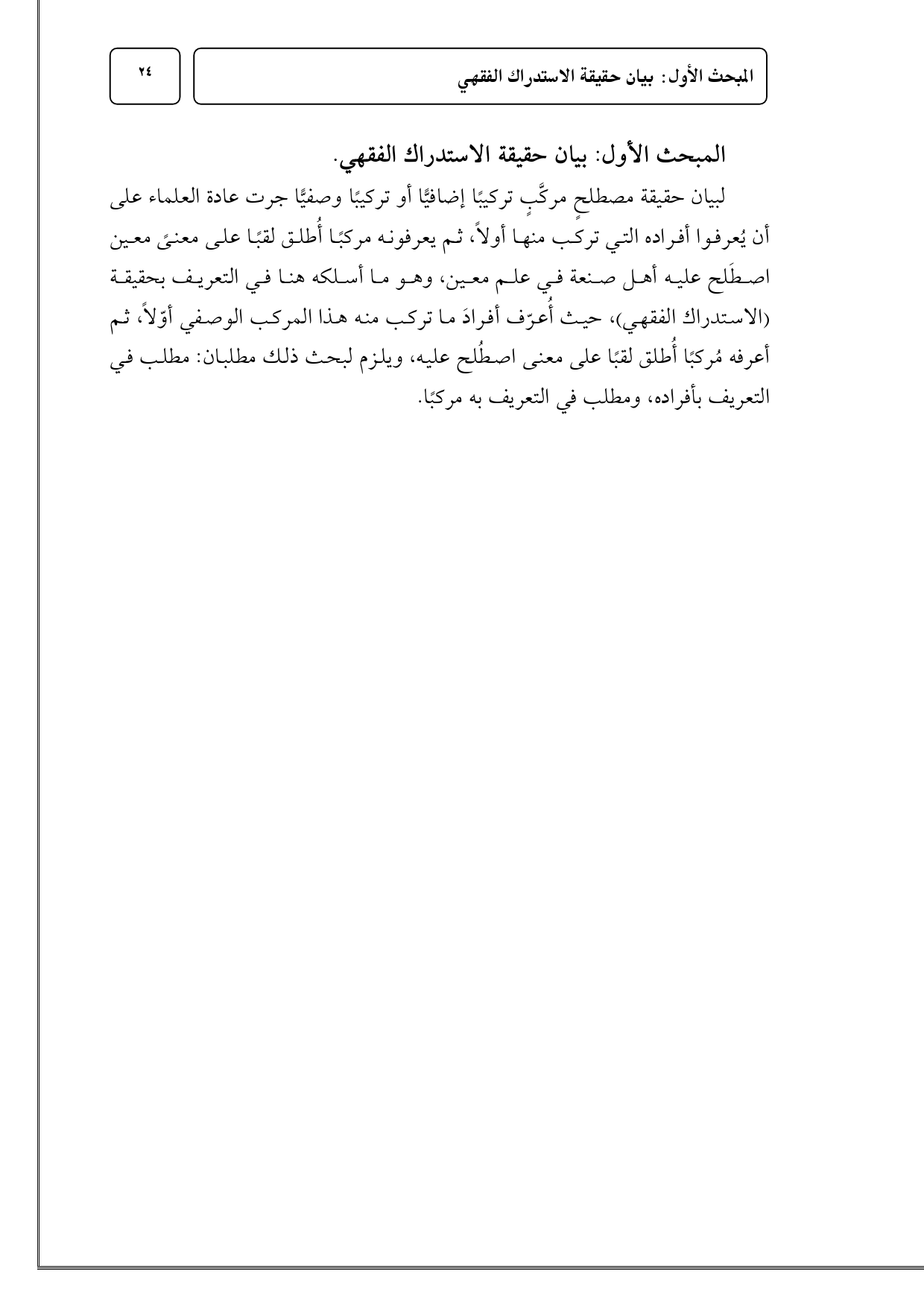 لبيان حقيقة مصطلحٍ مركَّبٍ تركيبًا إضافيًّا أو تركيبًا وصفيًّا جرت عادة العلماء على أن يُعرفوا أفراده التي تركب منها أولاً، ثم يعرفونه مركبًا أُطلق لقبًا على معنىً معين اصطَلح عليه أهل صنعة في علم معين، وهو ما أسلكه هنا في التعريف بحقيقة (الاستدراك الفقهي)، حيث أُعرّف أفرادَ ما تركب منه هذا المركب الوصفي أوّلاً، ثم أعرفه مُركبًا أُطلق لقبًا على معنى اصطُلح عليه، ويلزم لبحث ذلك مطلبان: مطلب في التعريف بأفراده، ومطلب في التعريف به مركبًا.
