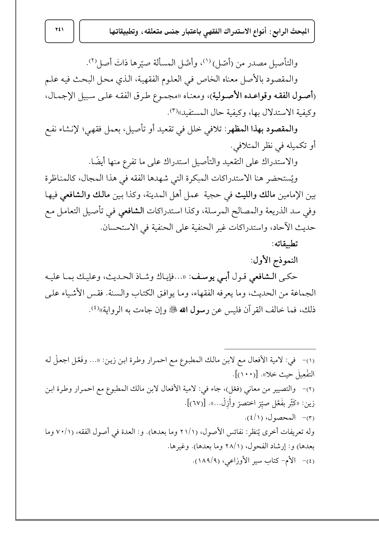 ويُستحضر هنا الاستدراكات المبكرة التي شهدها الفقه في هذا المجال، كالمناظرة بين الإمامين مالك والليث في حجية عمل أهل المدينة، وكذا بين مالك والشافعي فيها وفي سد الذريعة والمصالح المرسلة، وكذا استدراكات الشافعي في تأصيل التعامل مع حديث الآحاد، واستدراكات غير الحنفية على الحنفية في الاستحسان.