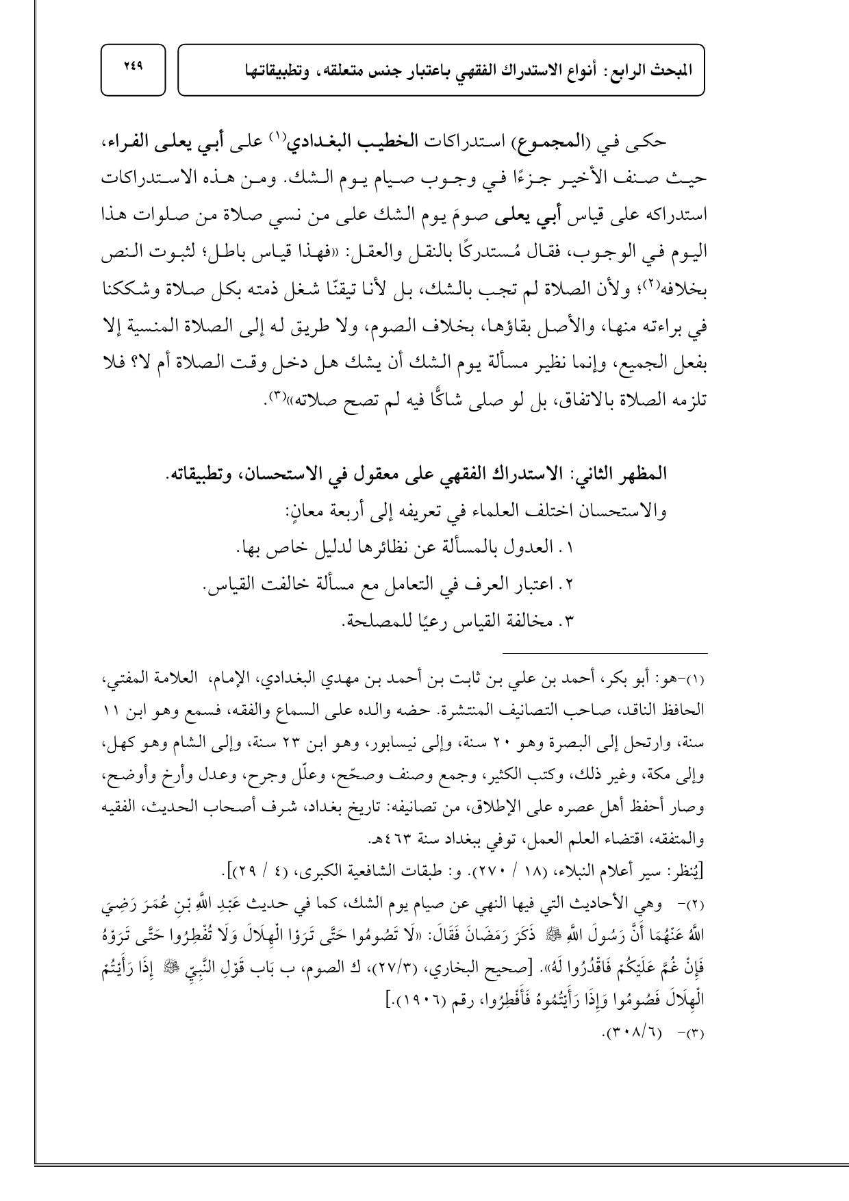 على أبي يعلى الفراء، حيث صنف الأخير جزءًا في وجوب صيام يوم الشك. ومن هذه الاستدراكات استدراكه على قياس أبي يعلى صومَ يوم الشك على من نسي صلاة من صلوات هذا اليوم في الوجوب، فقال مُستدركًا بالنقل والعقل: «فهذا قياس باطل؛ لثبوت النص بخلافه (¬2)؛ ولأن الصلاة لم تجب بالشك، بل لأنا تيقنّا شغل ذمته بكل صلاة وشككنا في براءته منها، والأصل بقاؤها، بخلاف الصوم، ولا طريق له إلى الصلاة المنسية إلا بفعل الجميع، وإنما نظير مسألة يوم الشك أن يشك هل دخل وقت الصلاة أم لا؟ فلا تلزمه الصلاة بالاتفاق، بل لو صلى شاكًّا فيه لم تصح صلاته» (¬3).